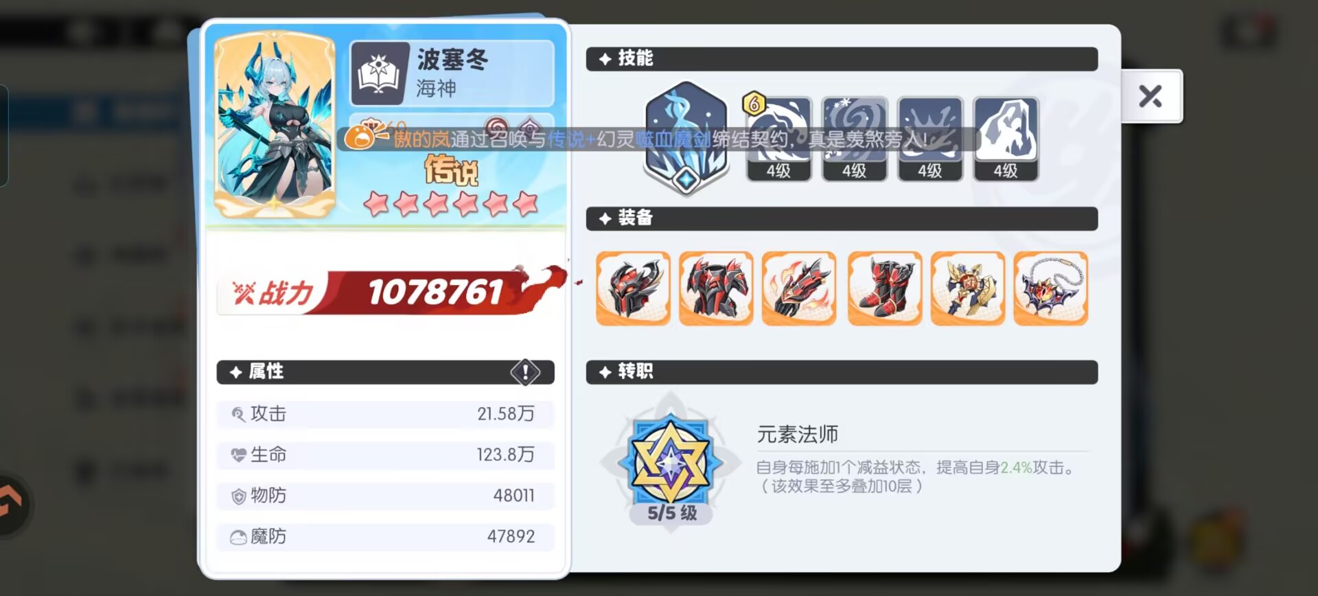 ④波塞东:可以增加敌方奥义的费用,配合奥法领主有效延长敌人的启动,同时还具备高额的伤害+击退能力和保命能力。