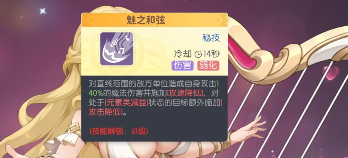 5:【秘技】魅之和弦:分析总结。维纳斯唯一的输出技能,能够对直线范围的敌人造成140%倍率的魔法伤害,并施加【攻速降低】的效果。