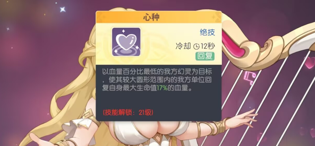 是一个范围型单体治疗技能,能够优先治疗生命最低的队友同时在她周围生成小型的范围治疗,可以回复自身17%的生命。