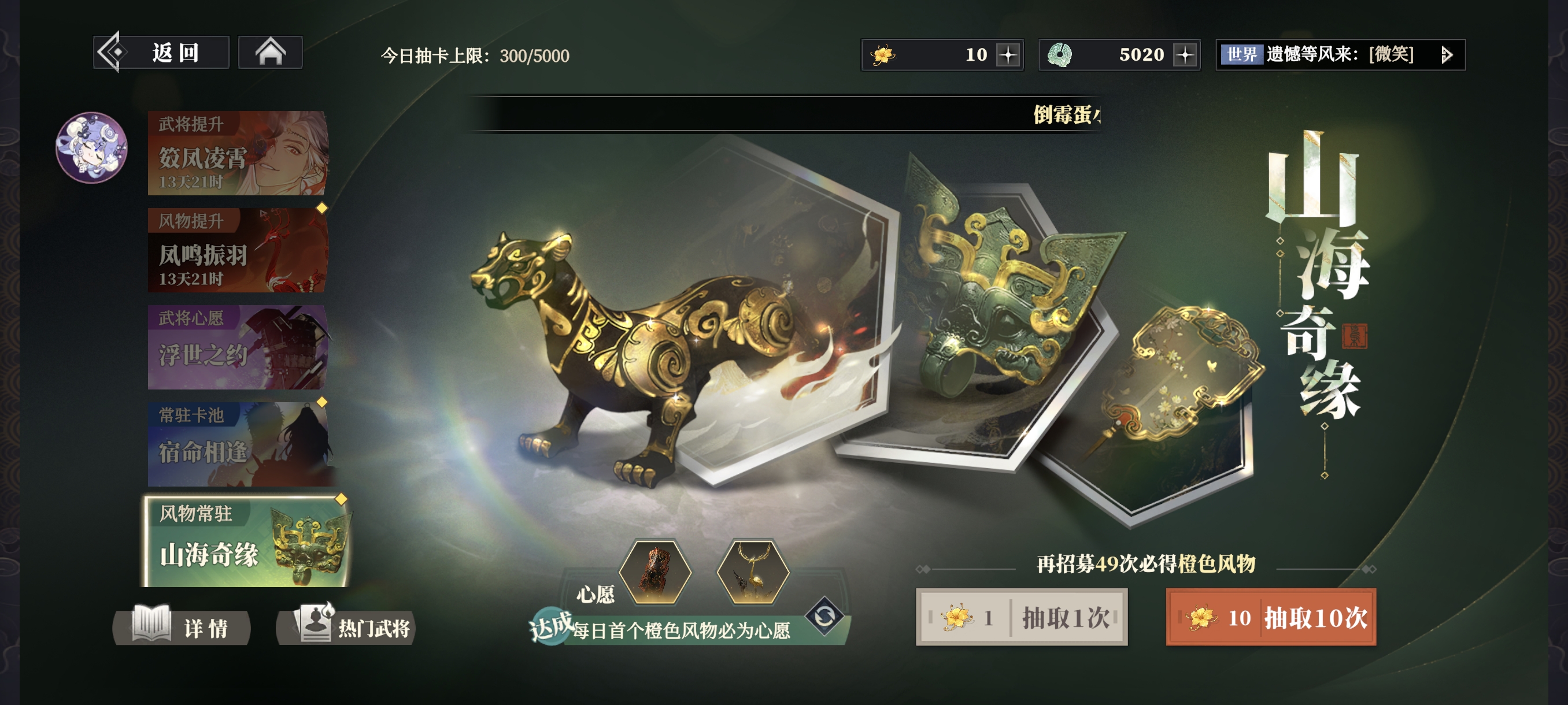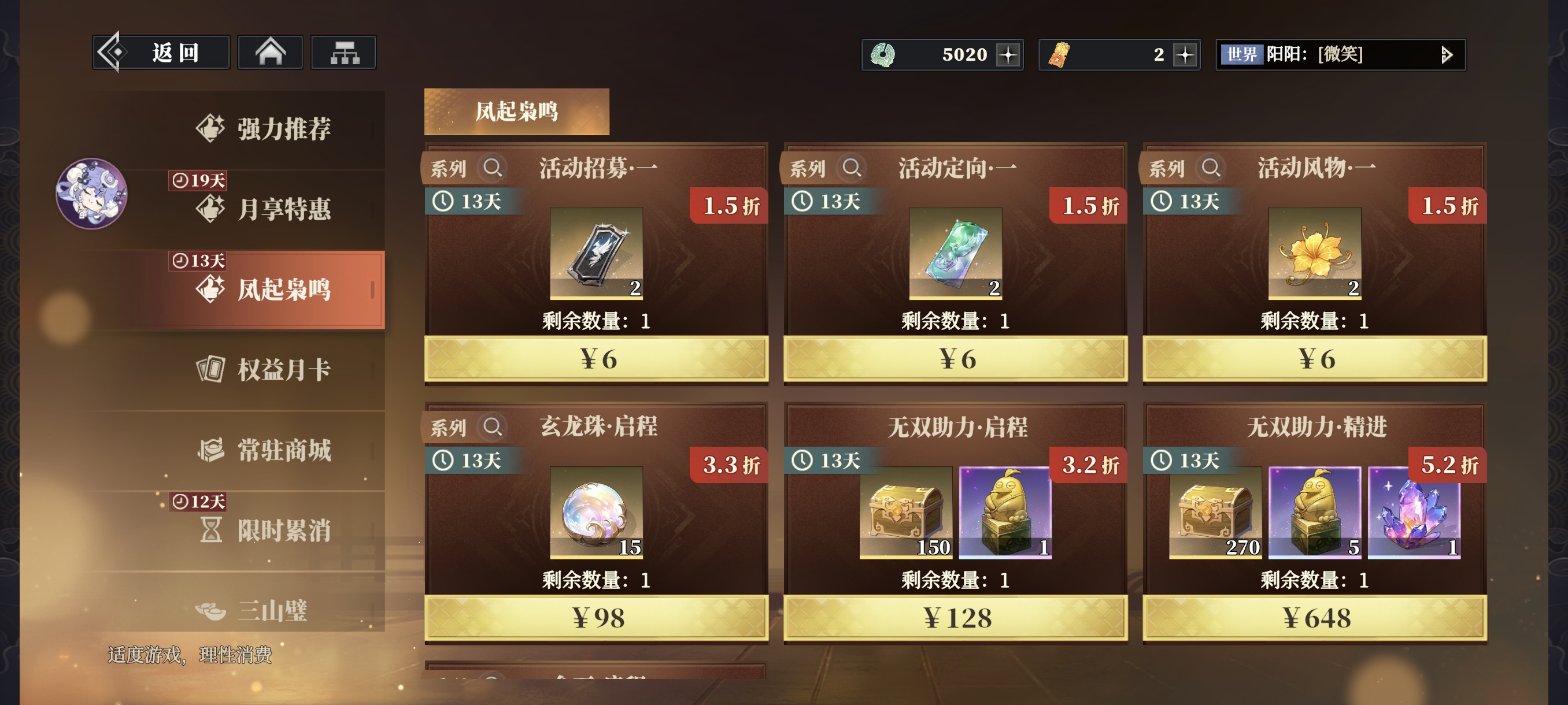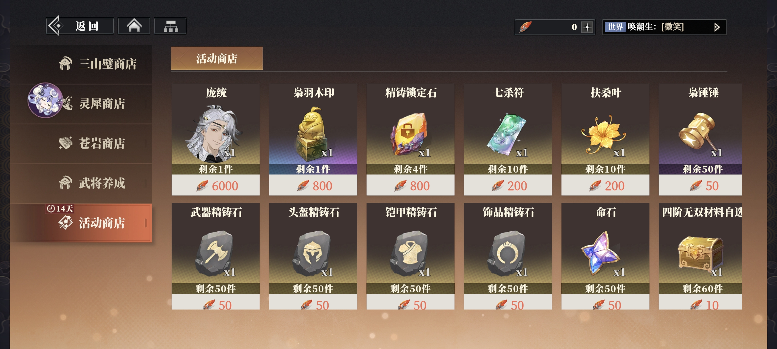 二、活动商店代币兑换商店,与往期一样可兑换限定武将本体1个、心愿抽风物抽10个等奖励,获得的代币基本足够换完所有重要资源。