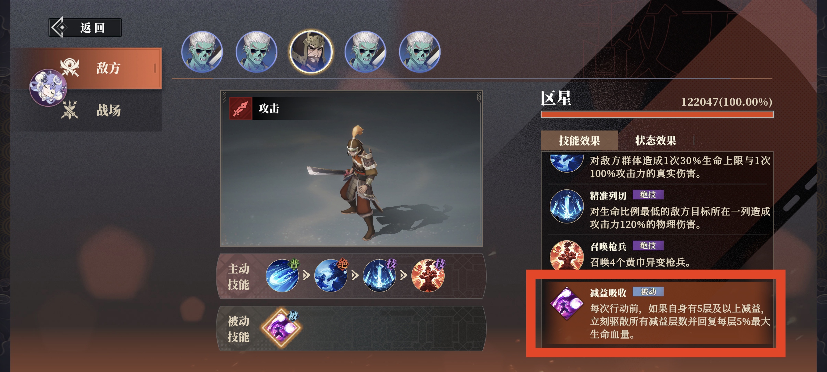 BOSS自带减益吸收机制,直接限制死了使用火毒队这类多减益阵容挑战BOSS的可能,另外对破防类的【斥候】和张郃等也做出了限制,一旦减益超出不仅会立即驱散还会额外回血。