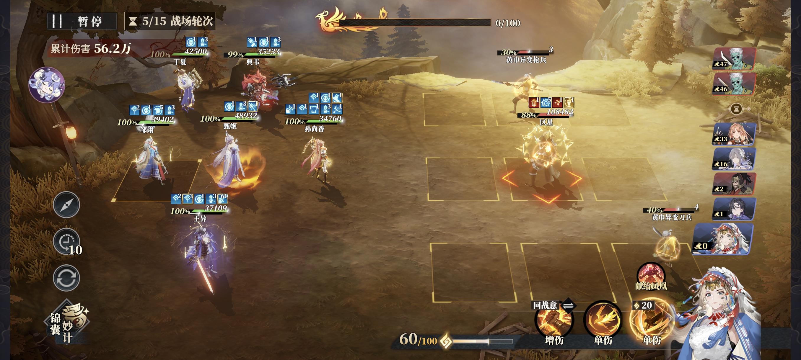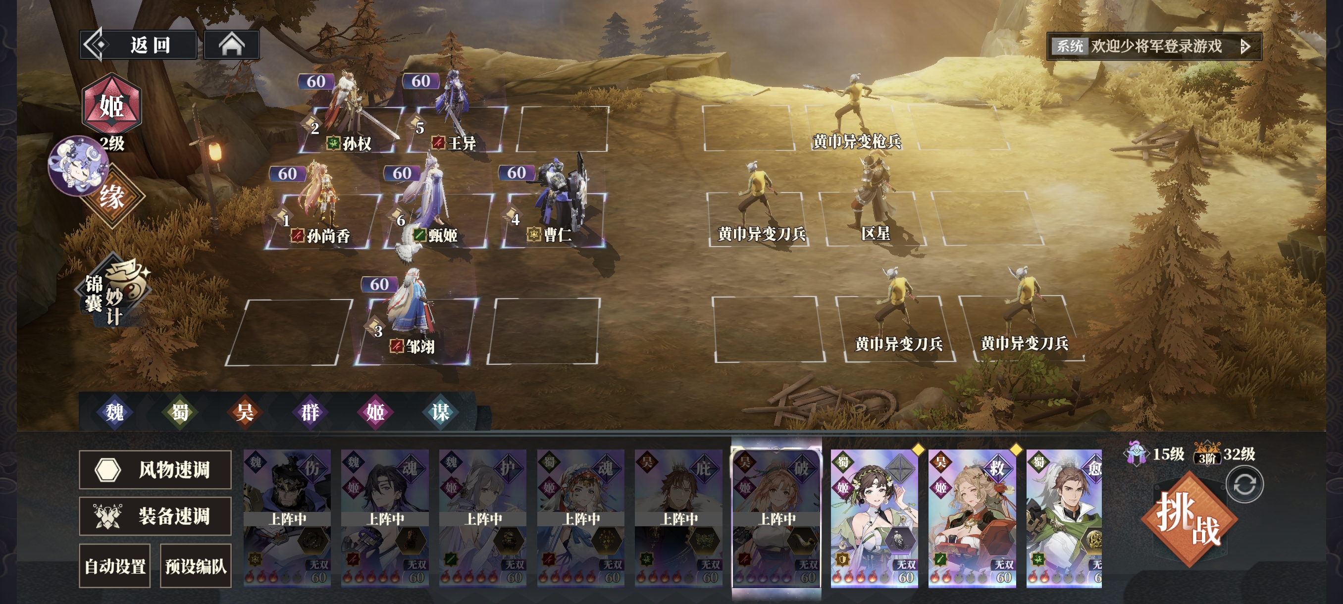 曹仁前排肉盾抗伤不用多说,最后一个位置选择孙尚香的主要原因就是香香是攻击武将,可以通过通用技能额外回复战意,并且自身普攻可直接攻击后排BOSS,香香全程通用+普攻攒战意即可。