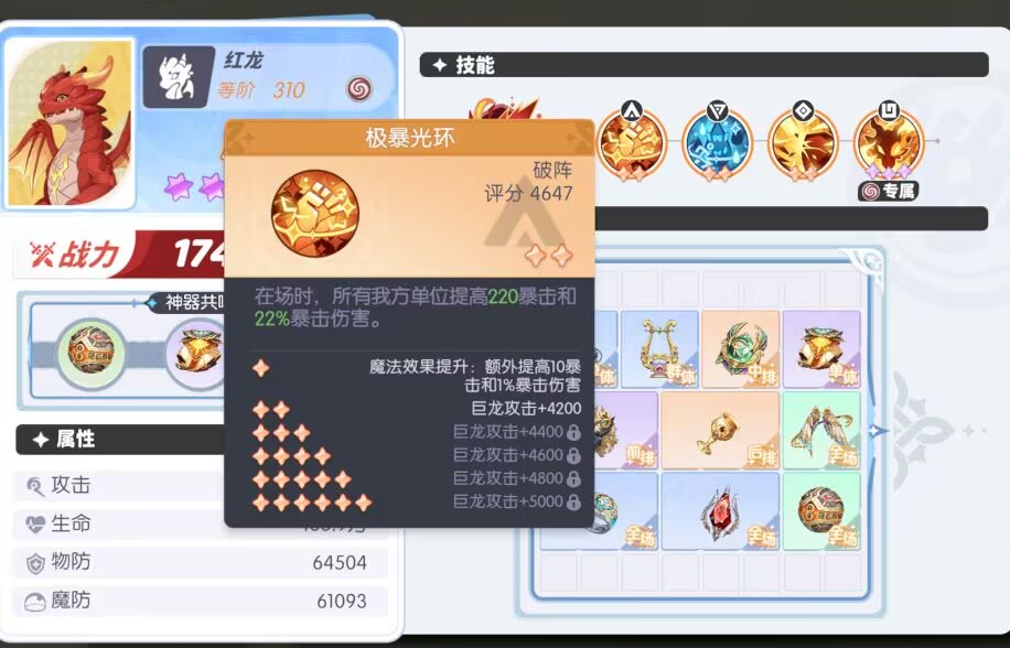 暴击越高!伤害就越大!玩这个角色像装备方面、巨龙神器、龙语魔法方面一定都要优先能够增加暴击率加成的。
