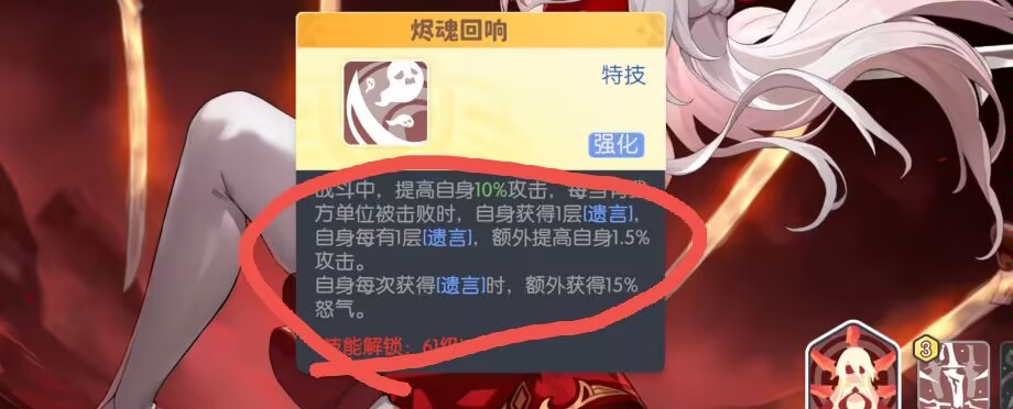 每1层=1.5%攻击加成,同时每次获得遗言都会获得15%的怒气,极大提升自身的启动能力和输出。