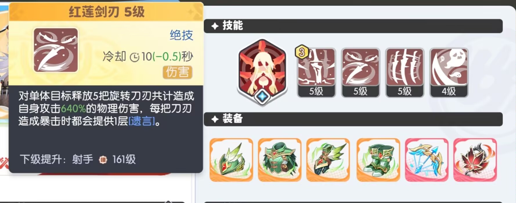 对单体目标释放5把刀刃共计造成480%倍率的物理伤害,没把刀刃造成暴击可以给自身额外提供遗言buff层数。