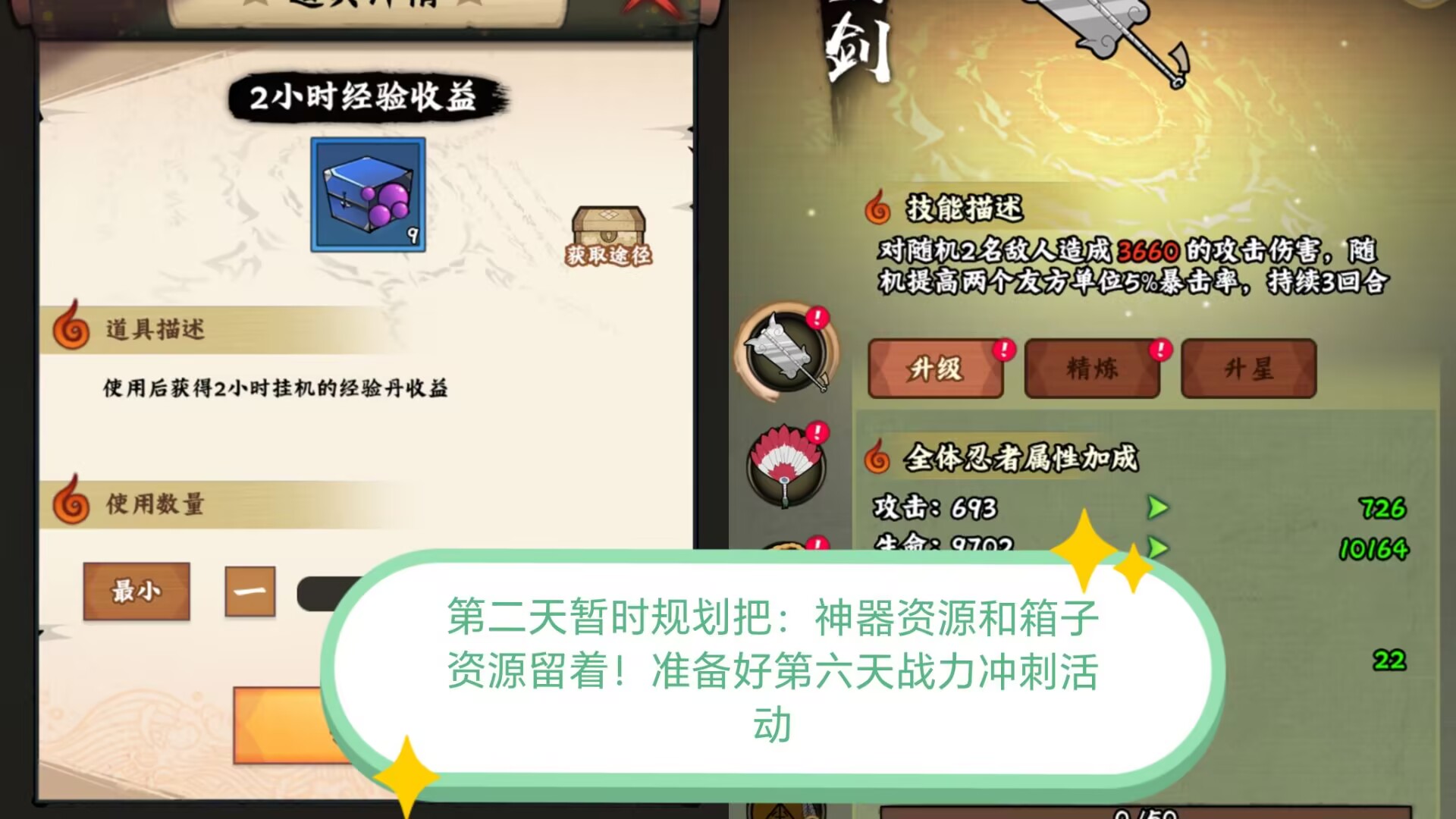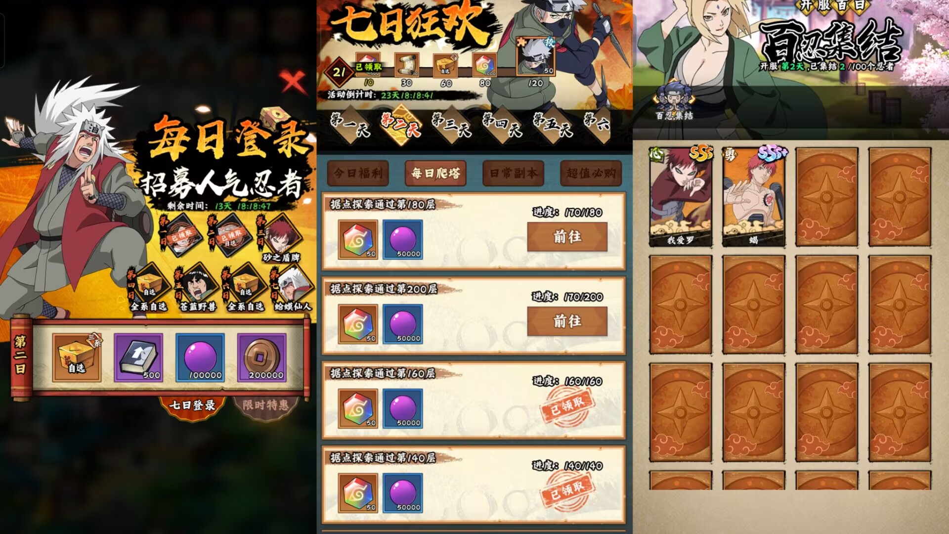 五:【第二天】最后总结。①总体来说第二天成长也是比较大的!成长之路送70抽左右!加上各类活动送的70抽!第二天高抽就有150抽可以给我们抽忍者。