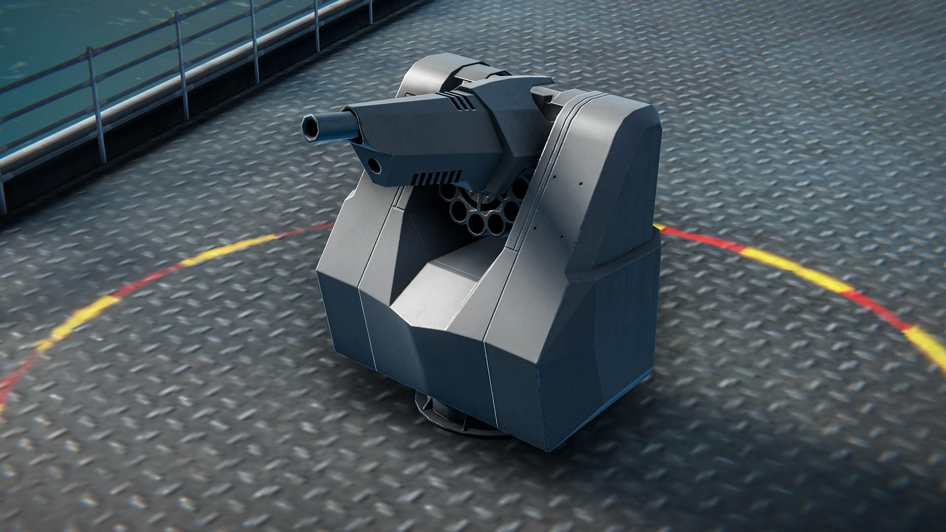 C国海军AFGS自动炮,现实中为反蛙人榴弹炮系统,游戏内作为反鱼雷自动炮。该炮为采用弹鼓式设计的防御性自动炮系统,可在全自动模式下对抗鱼雷威胁。AFGS能在近距离自动拦截敌方鱼雷,有效减轻作战人员人工追踪及应对水下威胁的负担。作为提升舰艇综合生存能力的附加防御手段,在敌方潜艇控制水域实施反制措施时,该自动炮系统具有显著战术价值。
