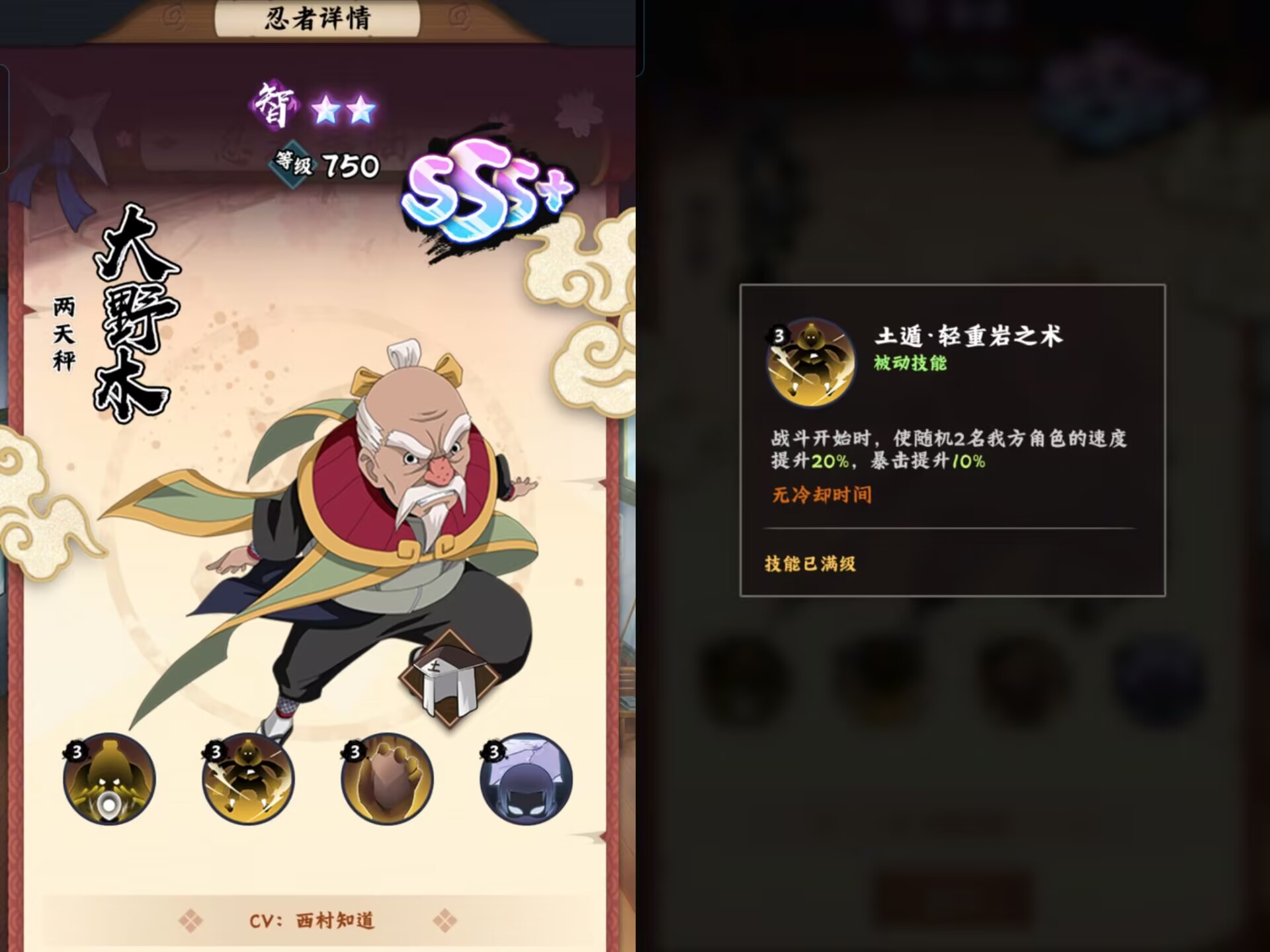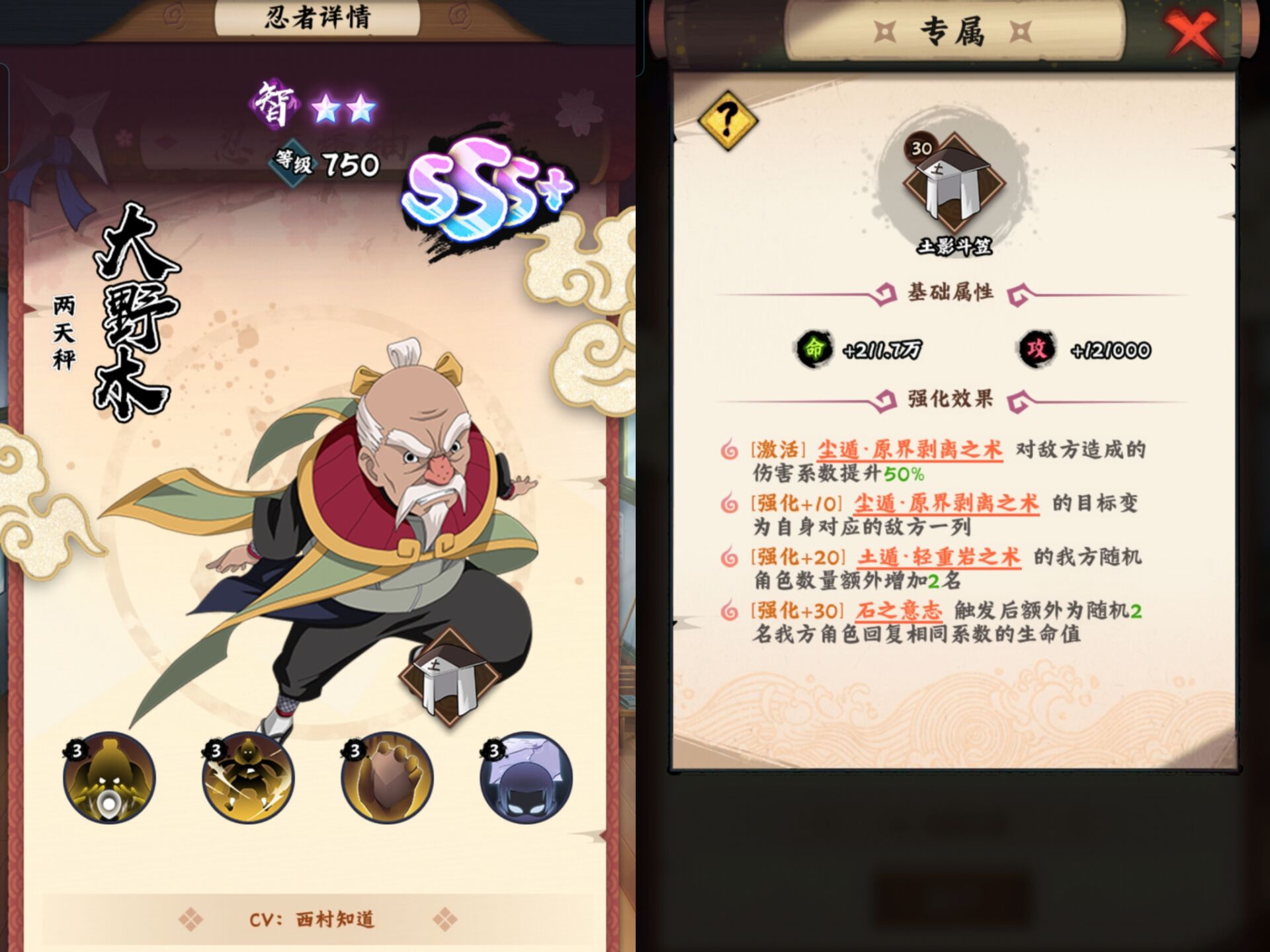 ③+20:能够让【土遁轻岩之术】随机目标提升到4名!给4名队友加速度!极大提升了队伍的先手机动性!未来以速度为王的时代!大野木还是很重要的!