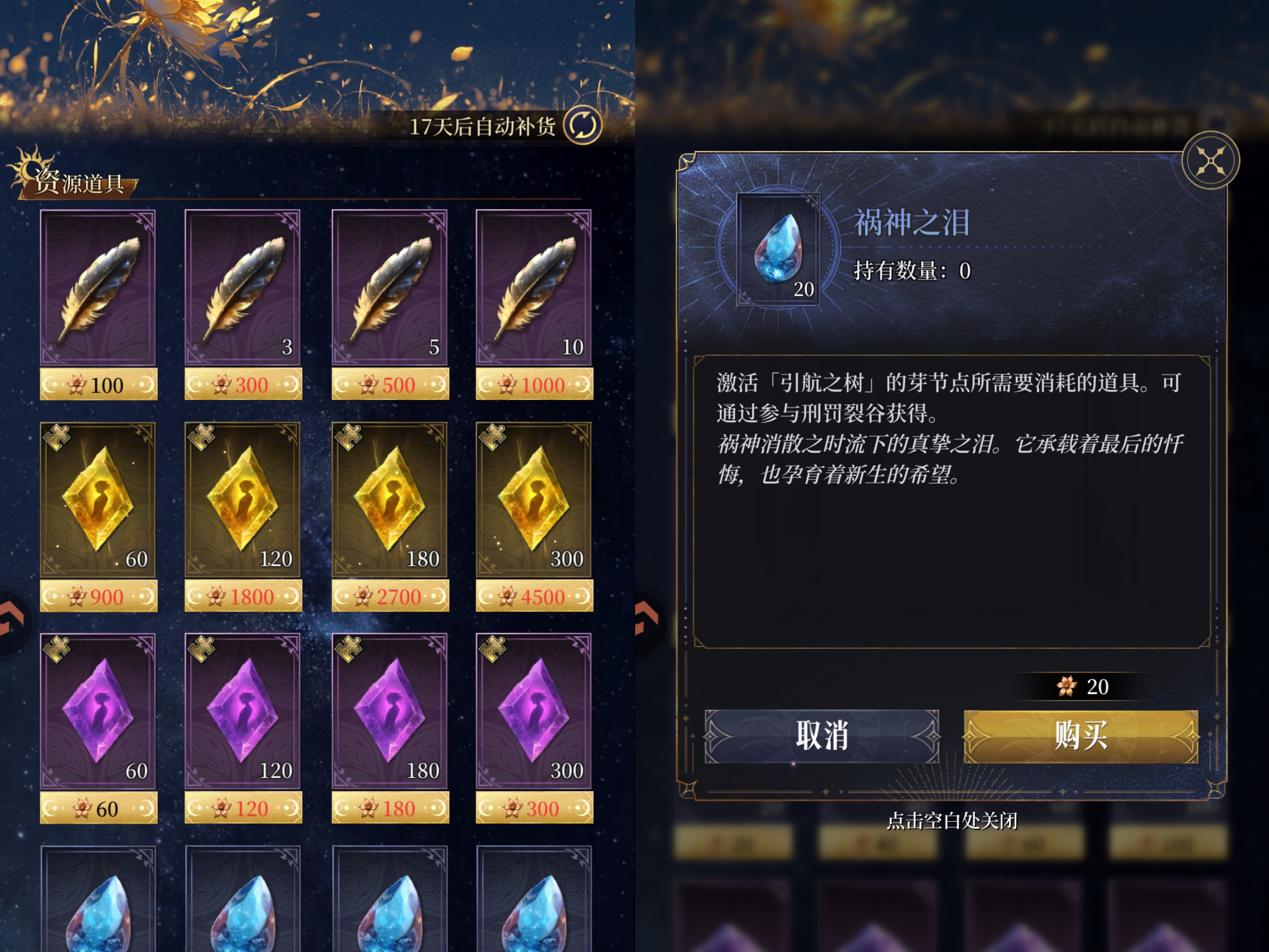 ①优先兑换【祸神之泪】这个是强化激活引航之树节点的重要道具,可以帮助我们提升更多的战力。