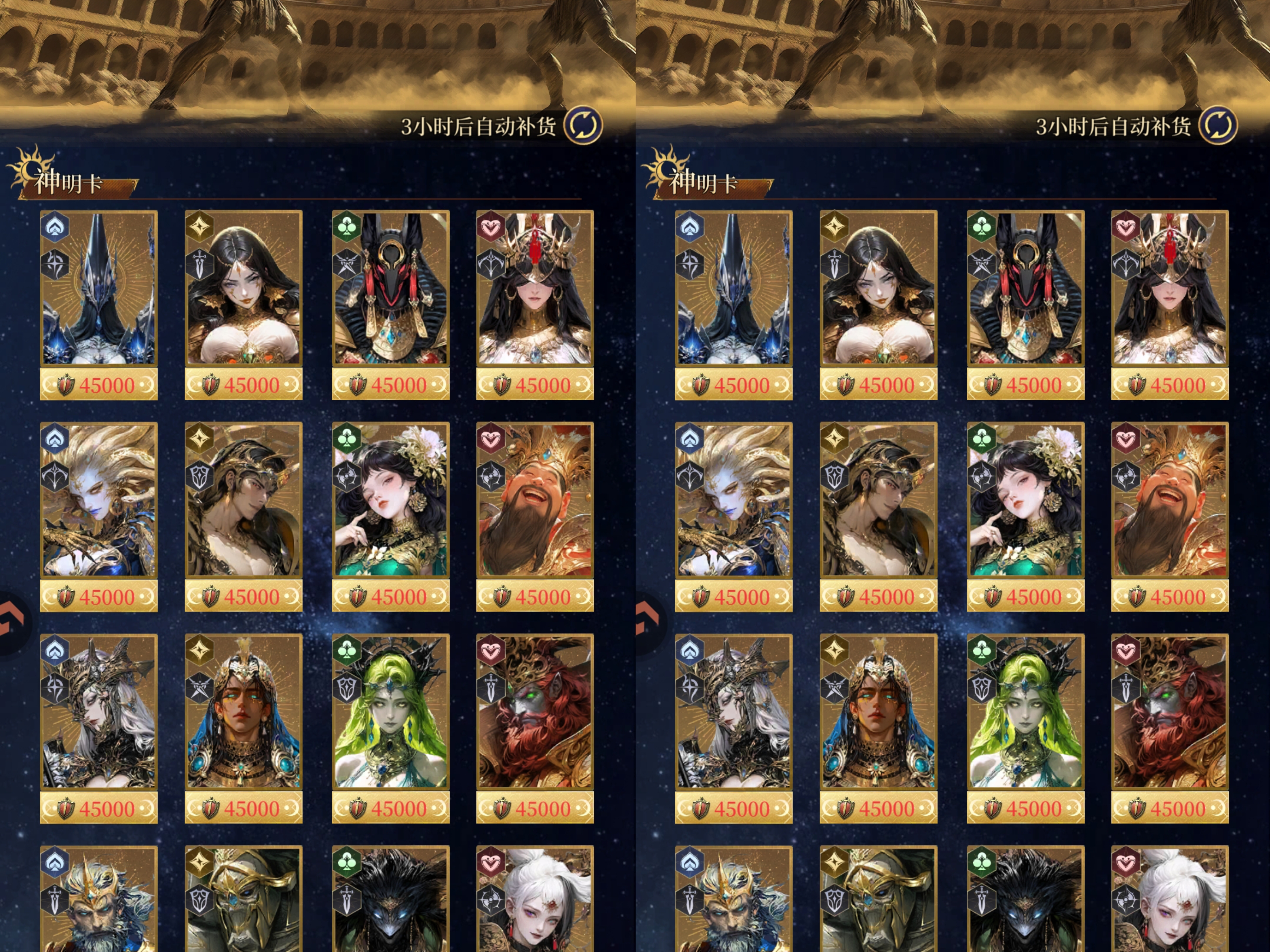 四:【角斗场】商店兑换推荐。使用【勇士勋章】兑换的商店,勋章主要来源就是我们的竞技场,这个商店需要结合自己阵容培养的神明来兑换,优先兑换自己的阵容的核心卡。