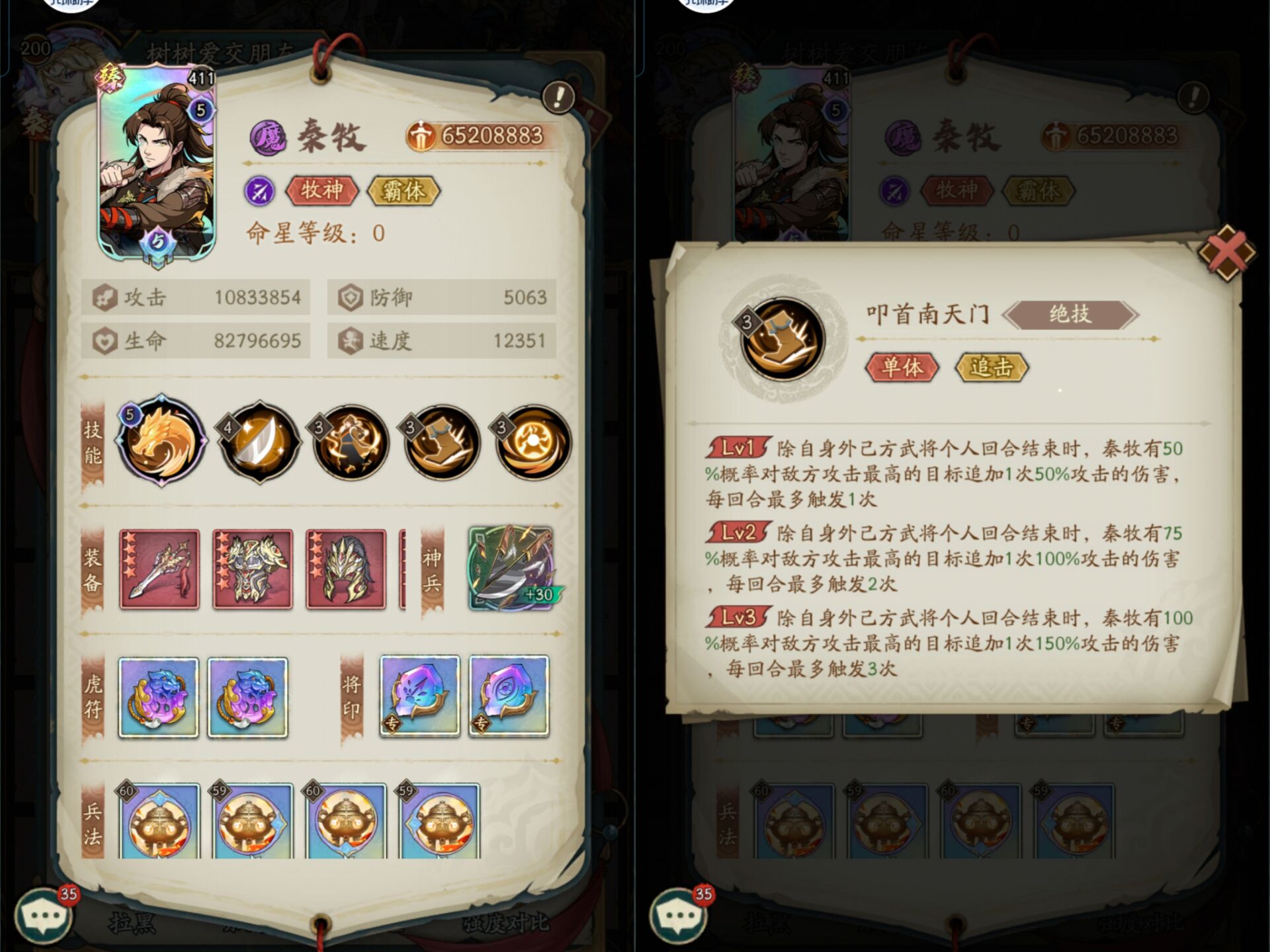 除了秦牧自己以外其他队友行动结束时候:秦牧会对敌方主c造成追击,每次追击=150%倍率的伤害,最大可以触发3次。