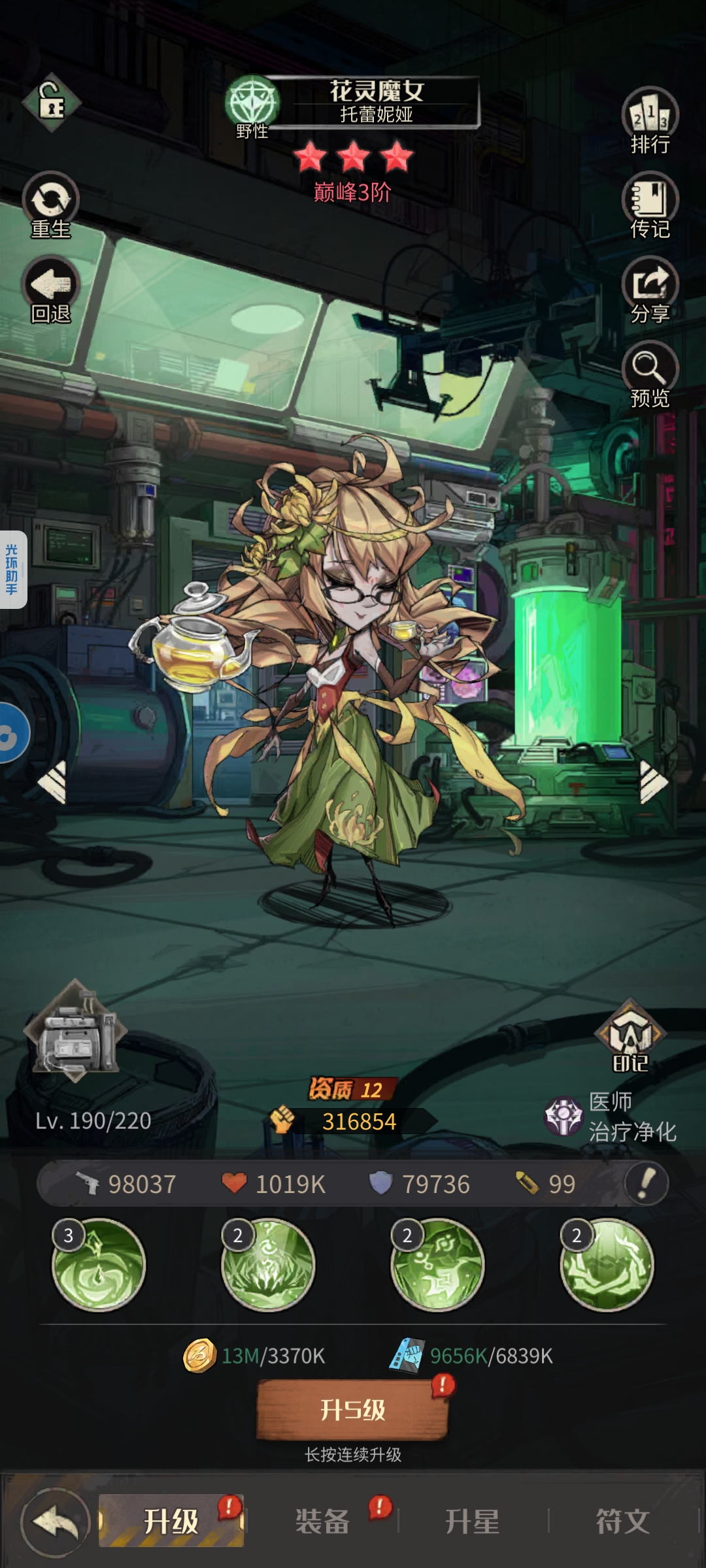 野性,治疗位天赋数值为12的角色。每回合结束被动给血量最低的两个角色附加治疗印记,且队友血量低于30还会有治疗被动触发,优势是大部分治疗不用看速度而是在队友血量低或者回合结束自动恢复避免了队友满血放治疗队友残血等冷却的尴尬局面。