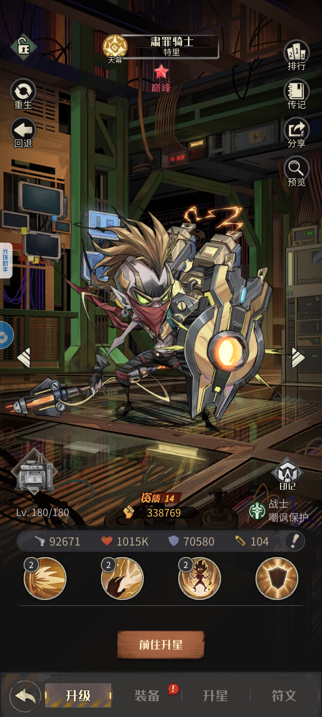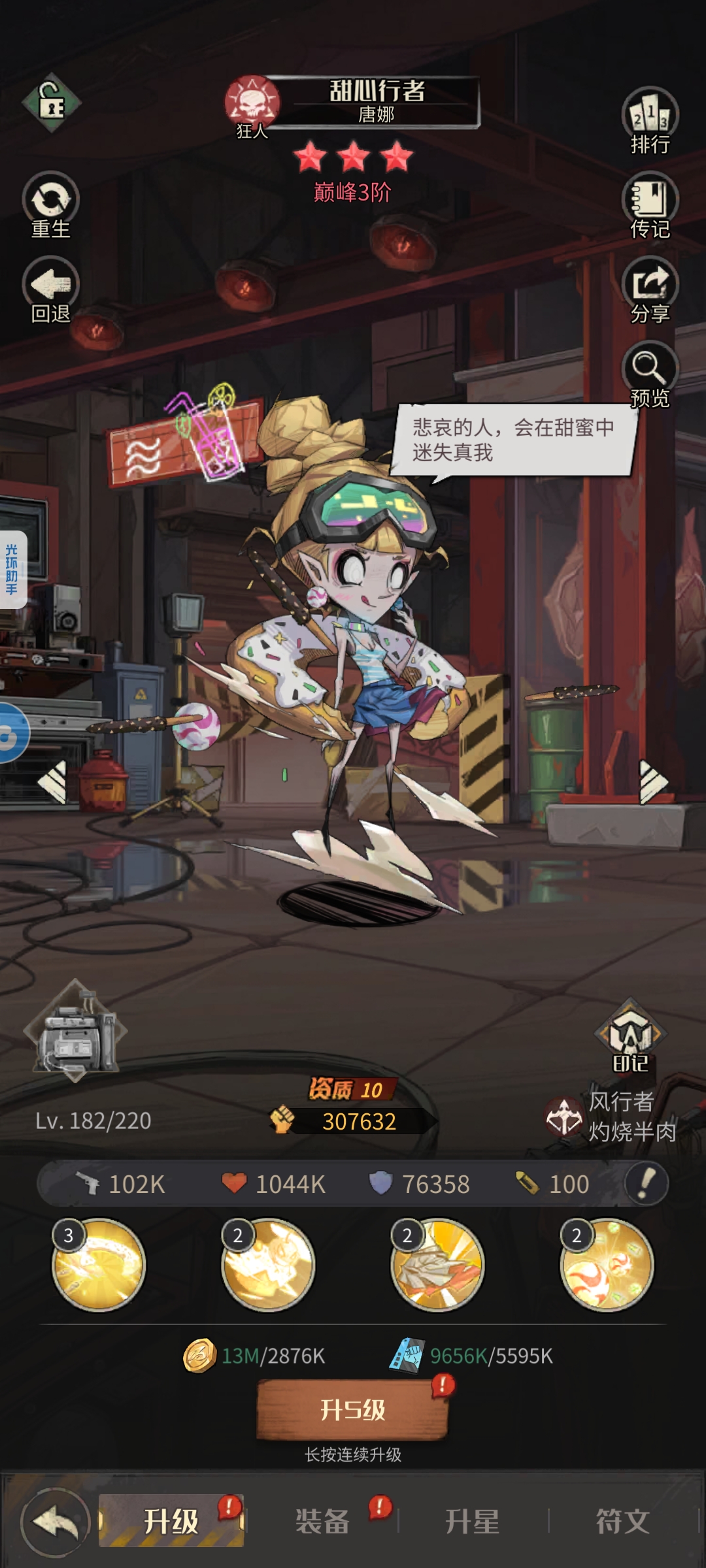 狂人,输出护盾混合位天赋数值10的半肉半输出角色,这个角色上阵主要是凑人头加能自奶可以作为坦克使用。主要坦克还是肃罪骑士,但是甜心行者靠自奶能力也能扛一扛,加上自身也有一点点输出。中期就可以把这个角色换掉了