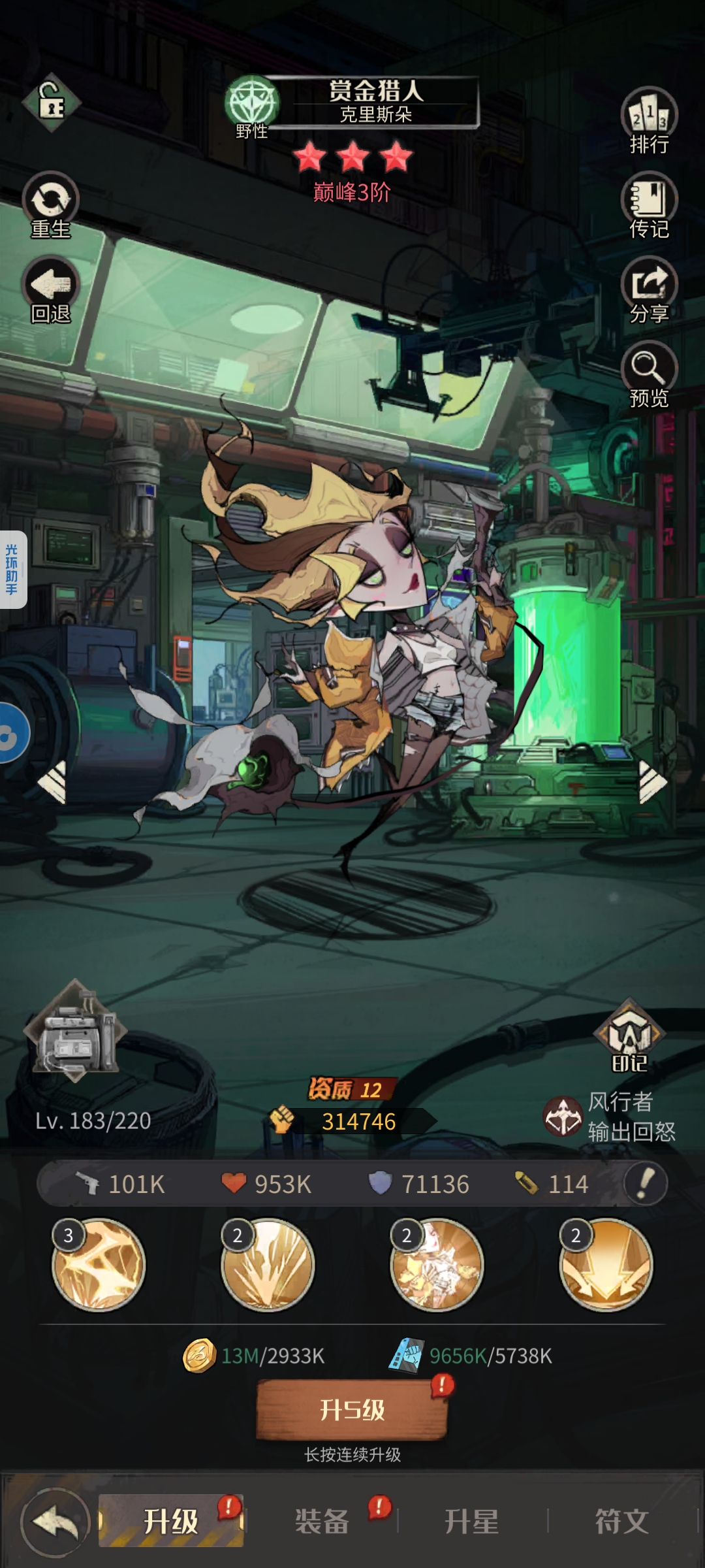 野性,输出位,天赋数值为12的输出角色,单体攻击,针对目标为敌方攻击力最高的角色也就是敌方核心输出,还带链接伤害能溅射到相邻的卡牌,还能自回能,单体伤害极高另外两个群攻打完后赏金猎人可以做到直接点死。
