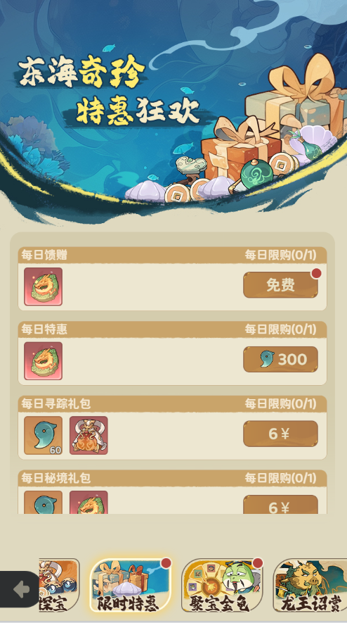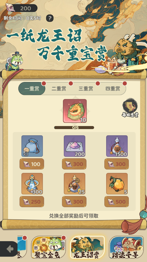 在【龙王诏赏】处领取龙王的每日悬赏,领取悬赏奖励水晶海螺。利用海螺货币兑换龙宫的各种珍稀资源及龙宫通宝吧!![]()