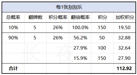 1、单张刮刮乐期望积分值为:112.92