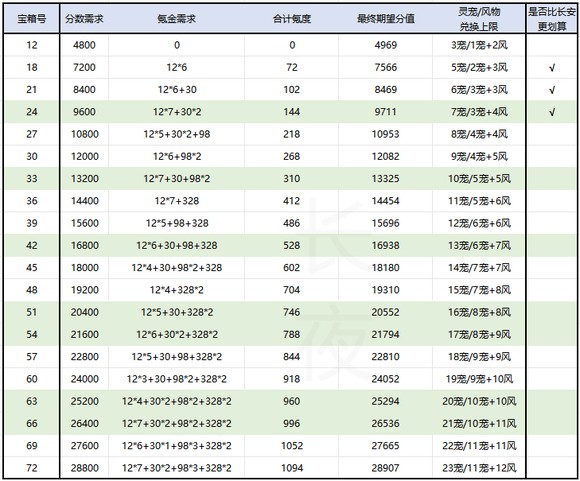 【标绿部分为边际收益相对更高的氪金方案,24层以下相比长安更便宜(长安1R=1灵宠碎片,1风物自选=40R)】