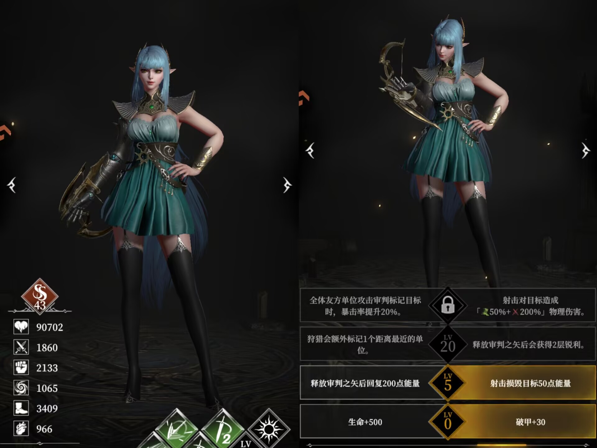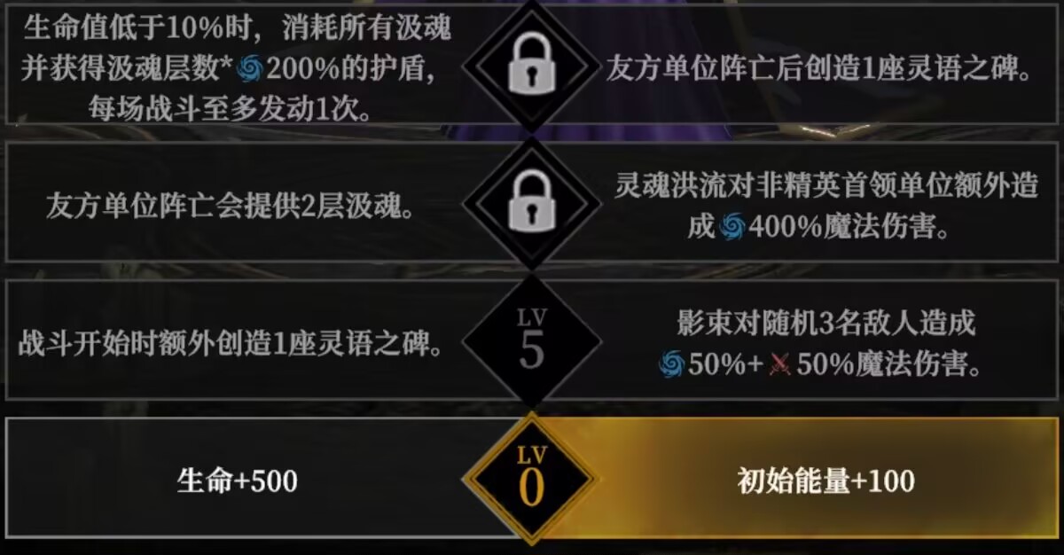 第二套天赋加点是:最后一排选择了保命,在生命低于10%的时候,可以获得额外护盾,提升了一定的反打能力和坦度。