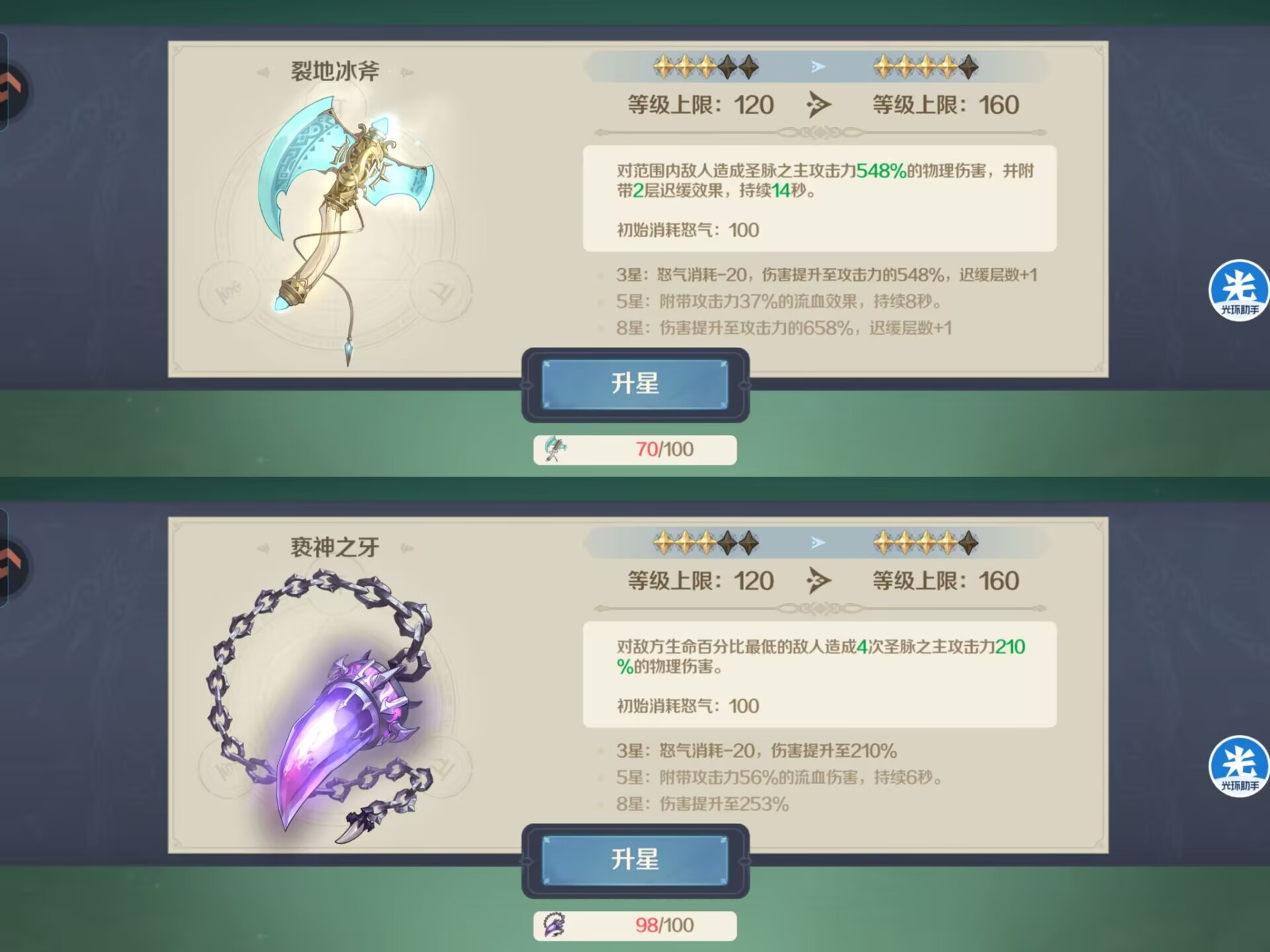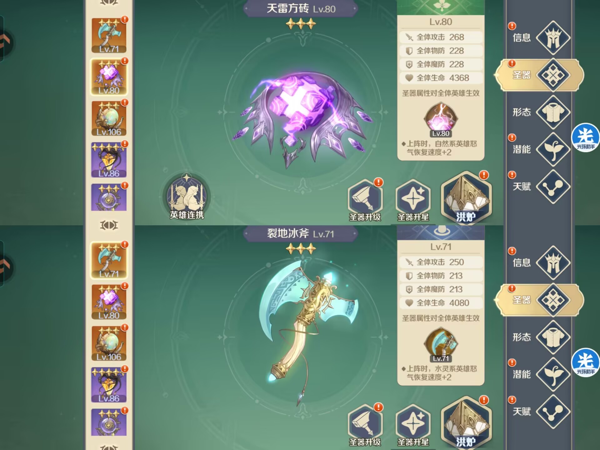 3:也可以次选【裂地冰斧】+【天雷方砖】也是可以考虑带的(哪个神器星比较高就优先用)