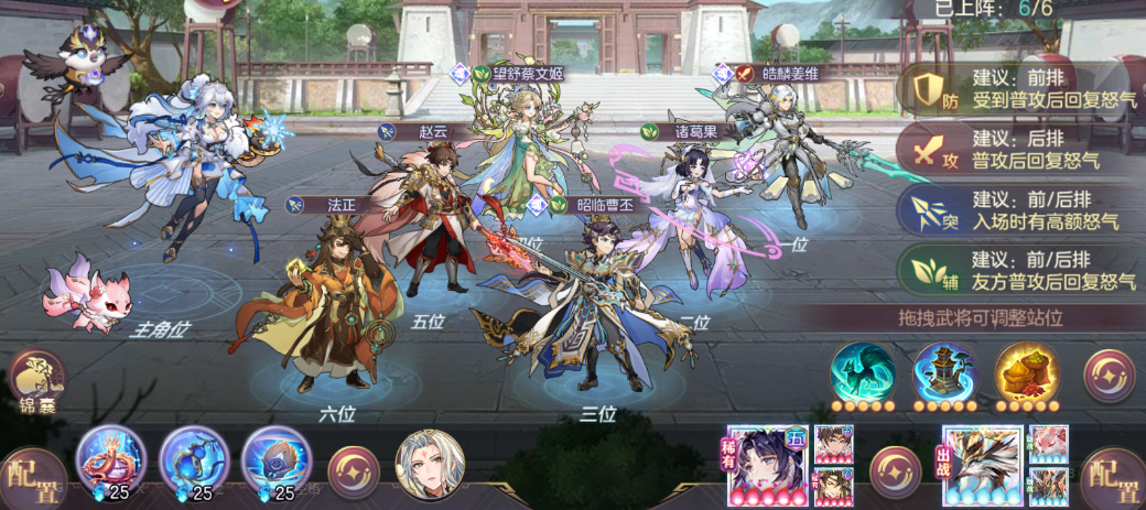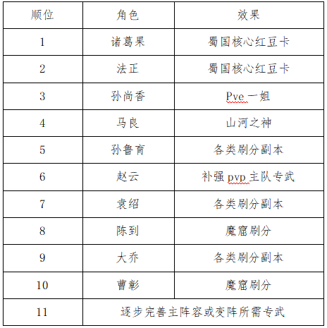 4、橙卡培养顺序:孙茹-诸葛果-赵云-法正-吕布-灵雎-孙尚香-马良-伏寿-孙鲁育-阴后-陈到-曹彰-其他。
