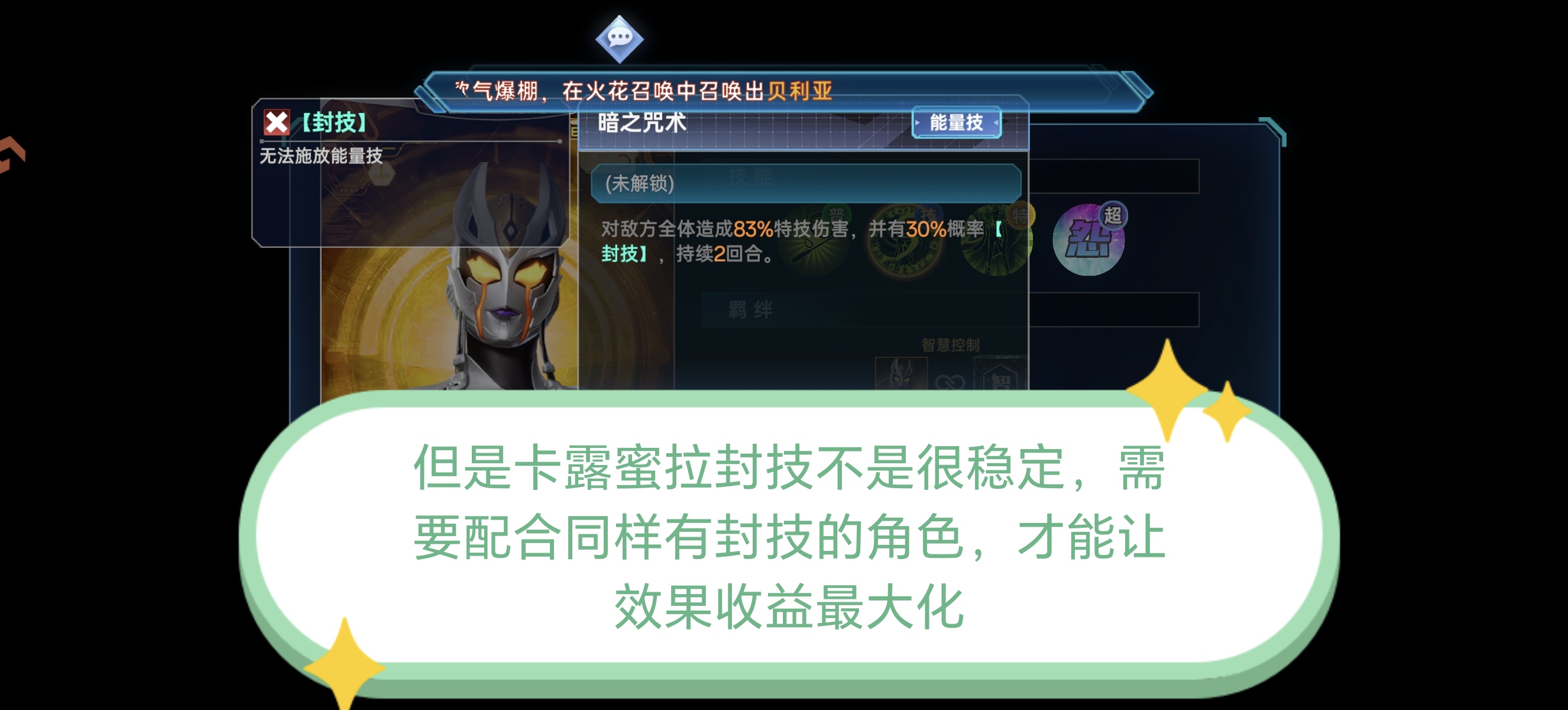 但是【卡露密拉】的封技配合上自身升星技能效果:封技可以额外同时触发多种效果:真伤、降能、降低回蓝效率、延长封技回合数等核心效果,因此【卡露密拉】一定要搭配能够同样可以释放封技的角色,这样才能够让封技的机制收益最大化,因为【卡露密拉】自身封技概率不是很稳定。
