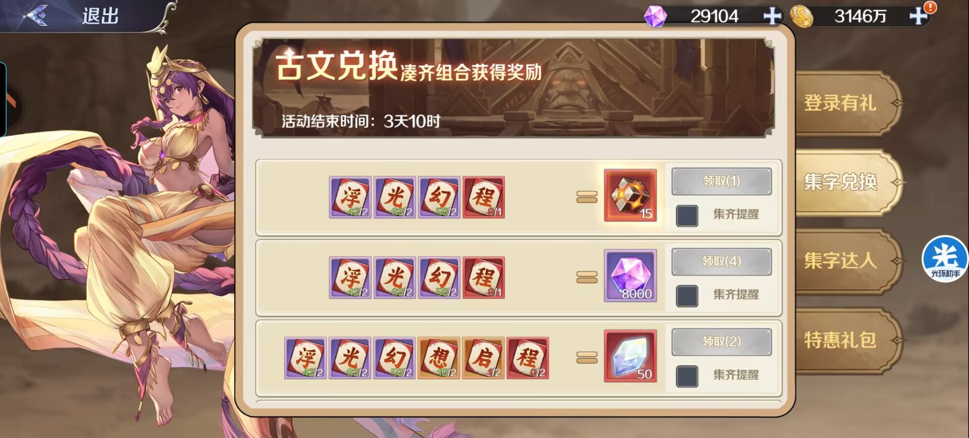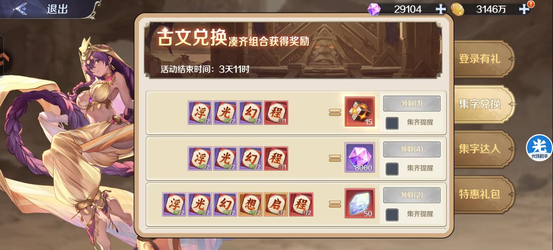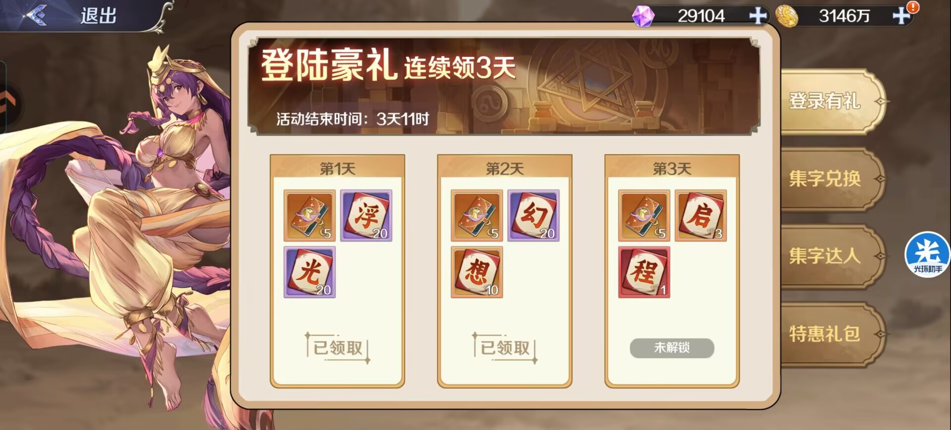②3天签到=20个浮、20个光、20个幻、10个想、3个启、1个程。