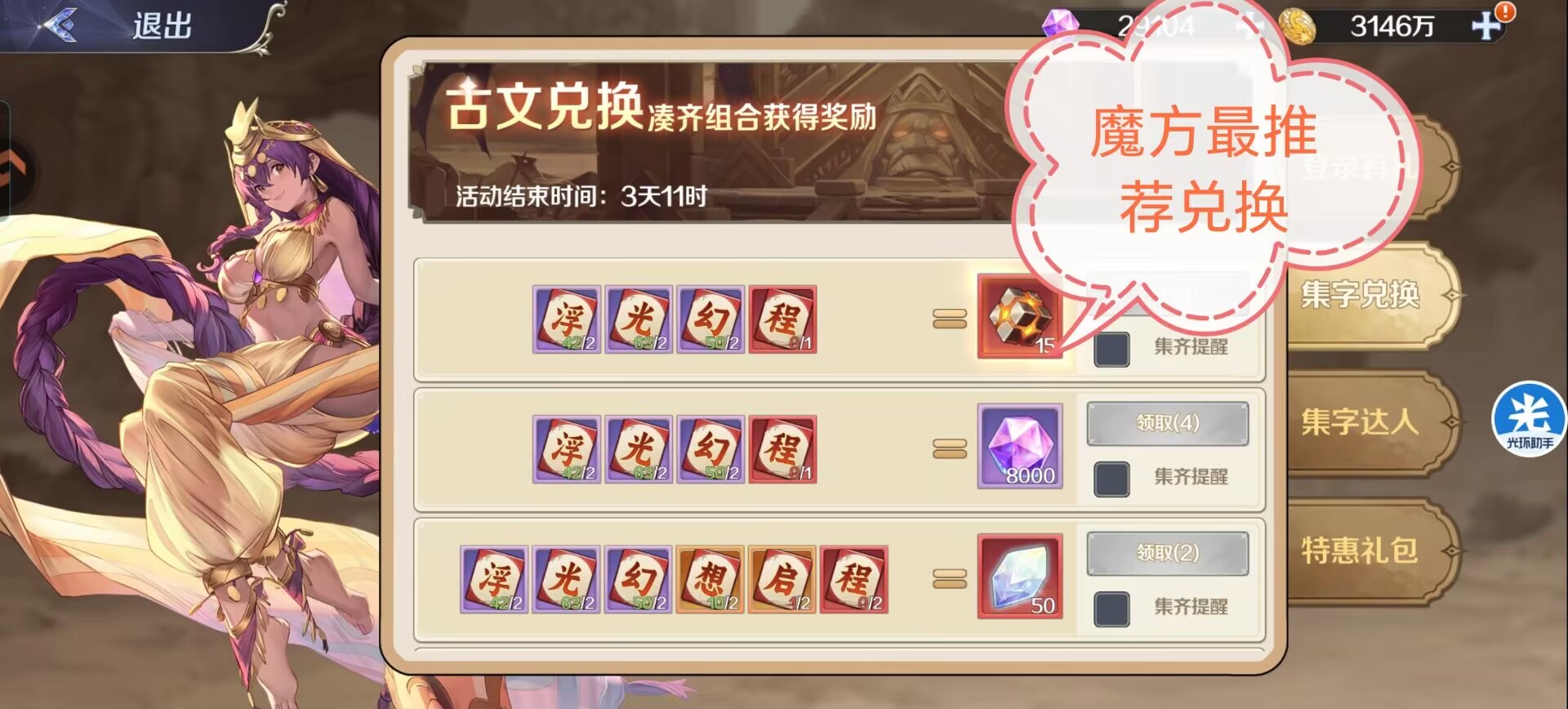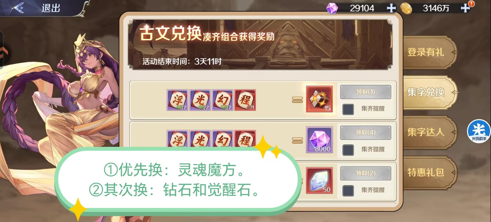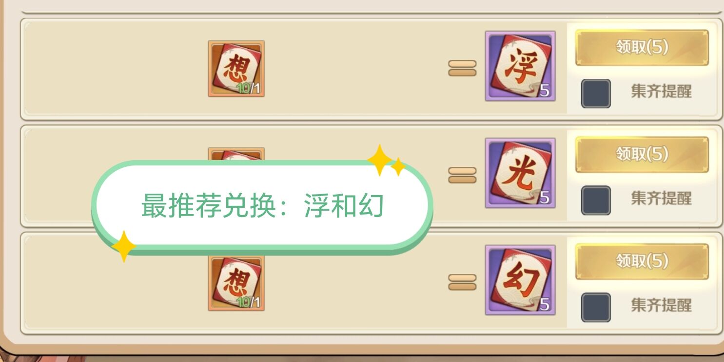 ③剩下的多余的字可以兑换:魂晶、少量钻石、以及精炼石这些道具。