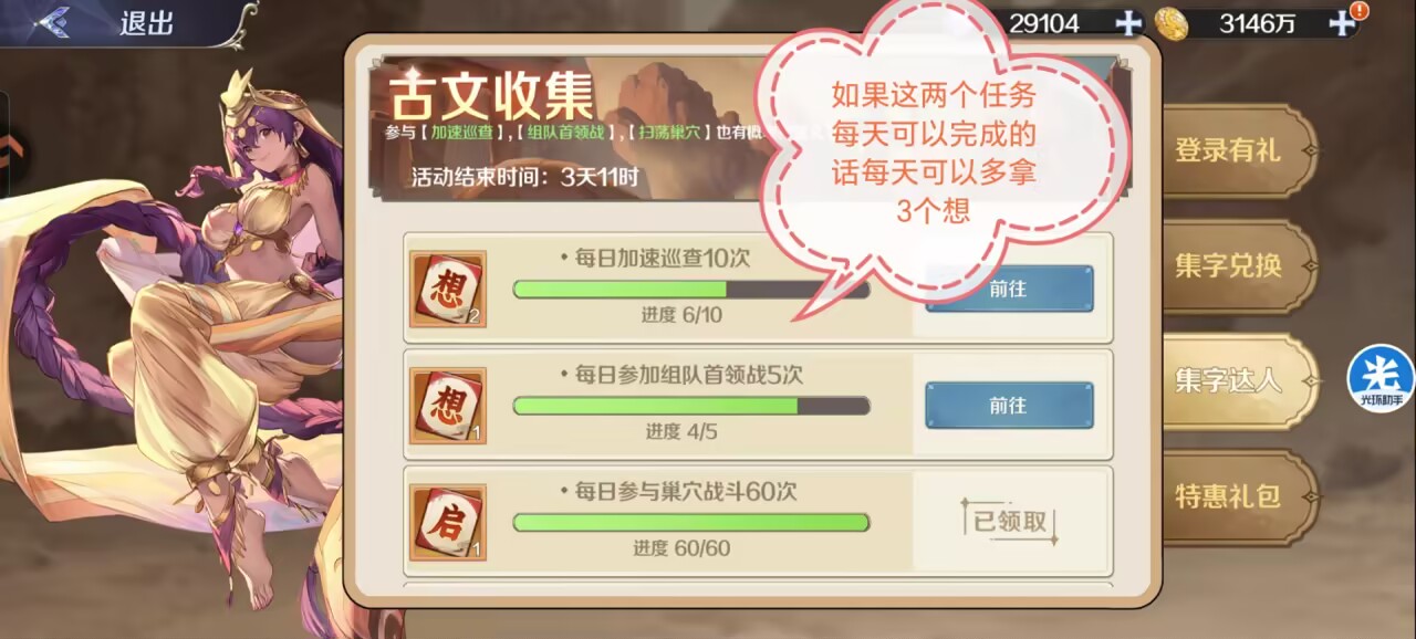 狮子给大家算下就知道了:①每天可以获得=21个光字+3个启字+4个想。因为首领战和加速的任务完成不了,所以每天这个已经是上限了。