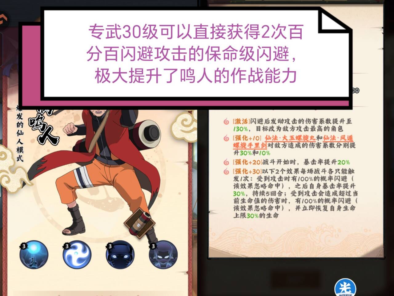 ④强化+30:完全质变,第一次仙鸣受到攻击必定闪避伤害,同时提升自己的暴击率(效果每场战斗只会触发一次)