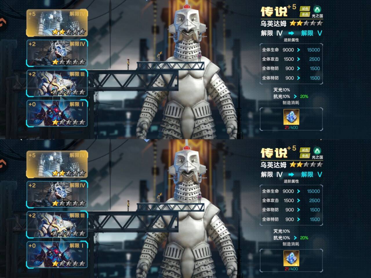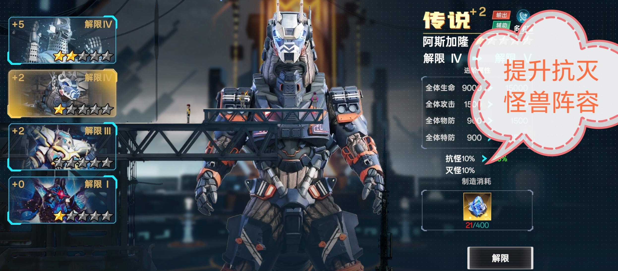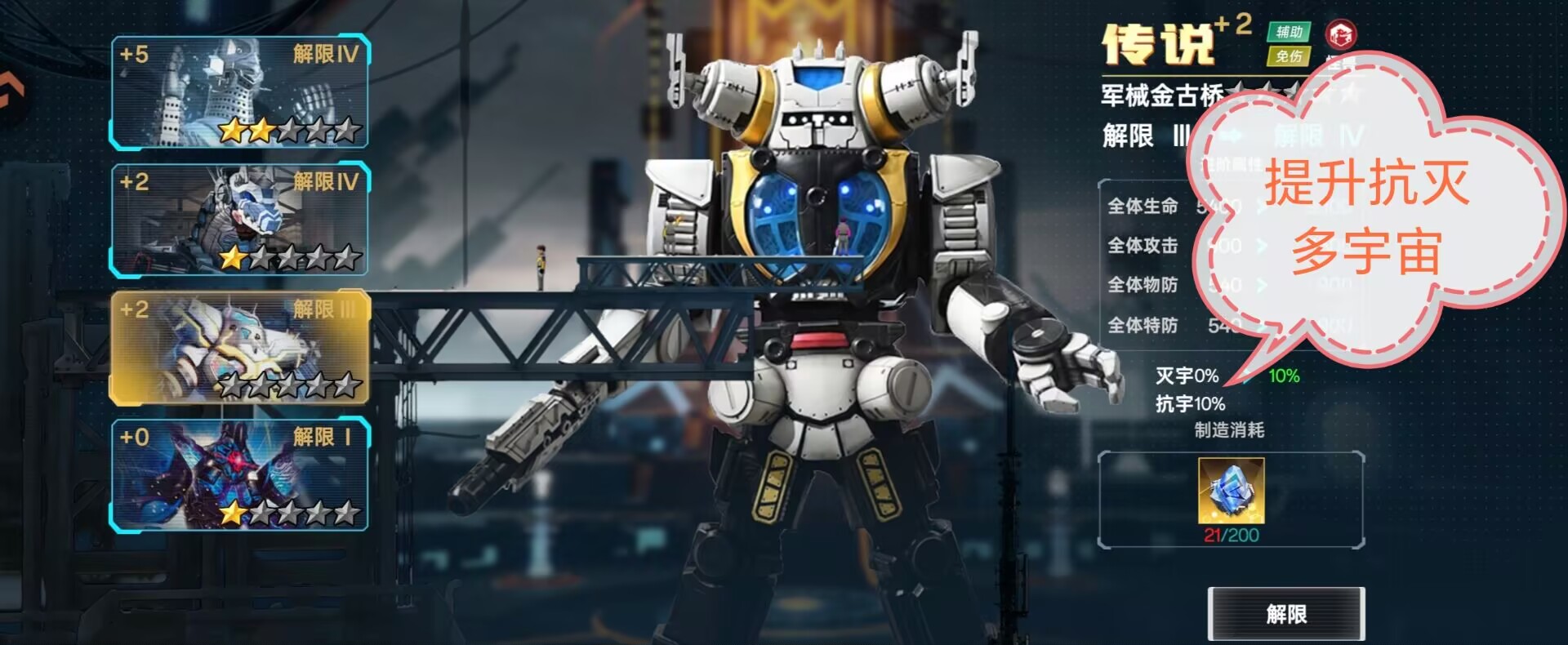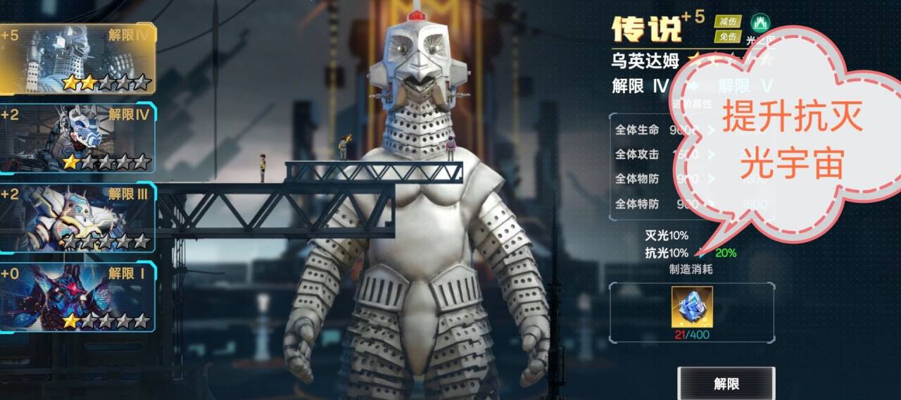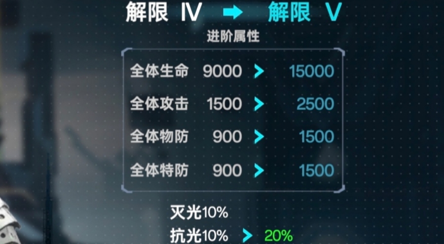 ②解限:一样可以提升我方全体属性,另外解限可以提升抗灭属性(解限需要消耗:动力源)