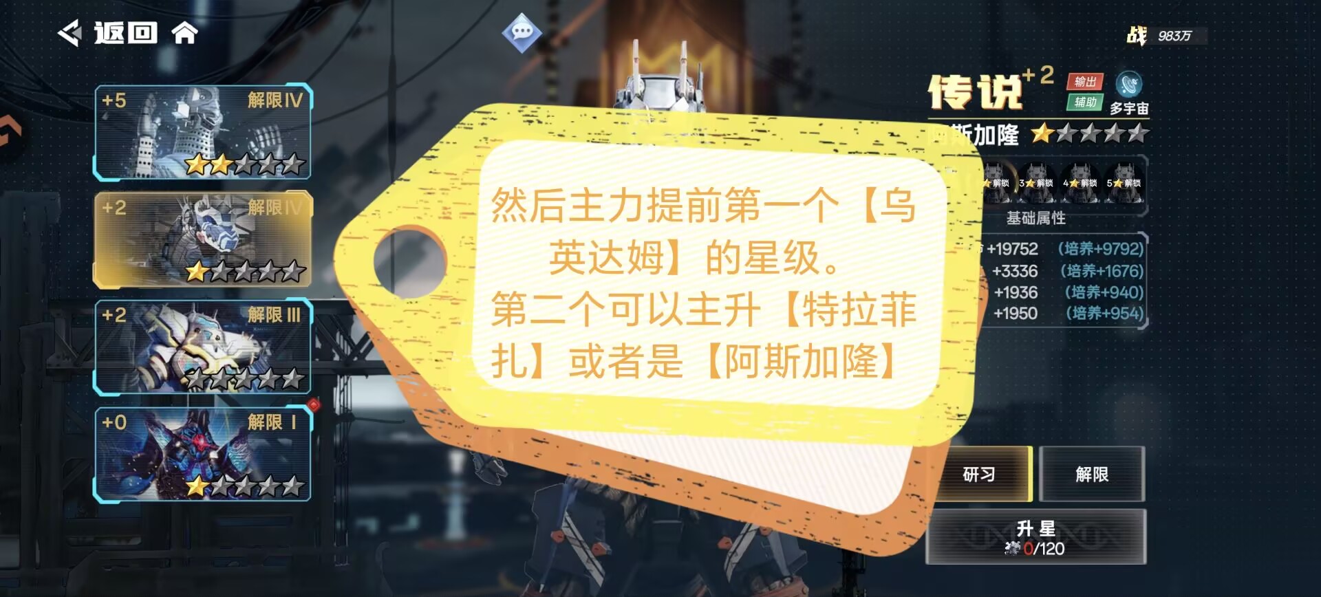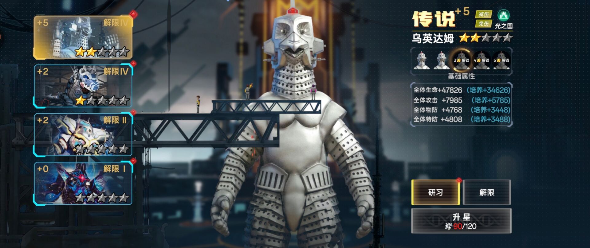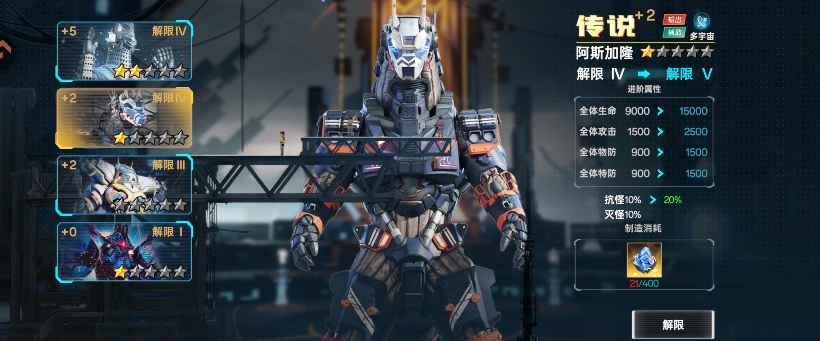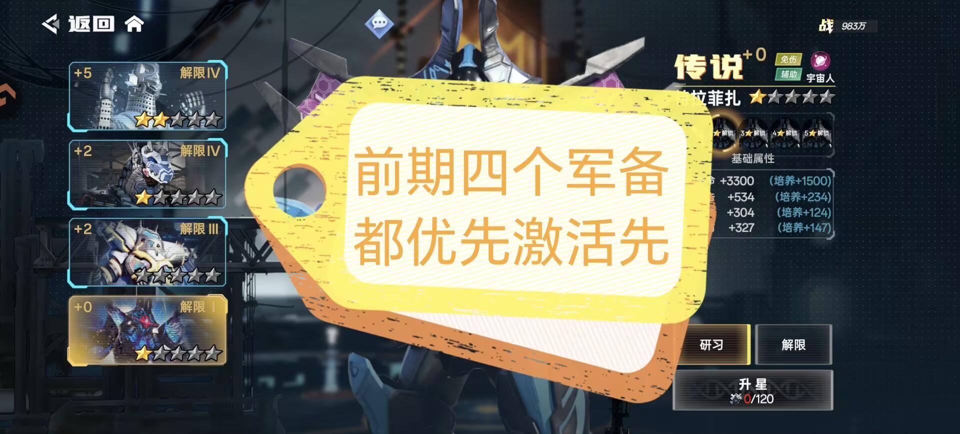 ②解限:一样可以提升我方全体属性,另外解限可以提升抗灭属性(解限需要消耗:动力源)