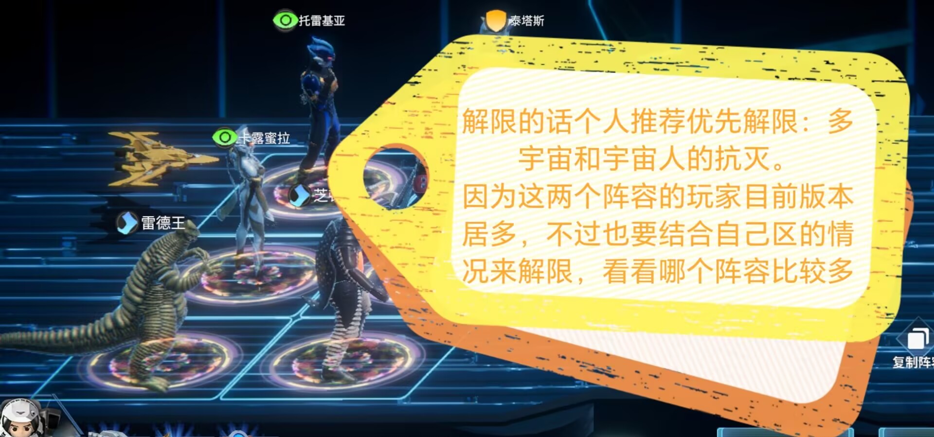 解限建议:这个主要是针对抗灭多宇宙阵容的,目前版本多宇宙出了特利迦以后,也去属于热门强力阵容,如果区里多宇宙阵容比较多的话这个建议大家优先解限。