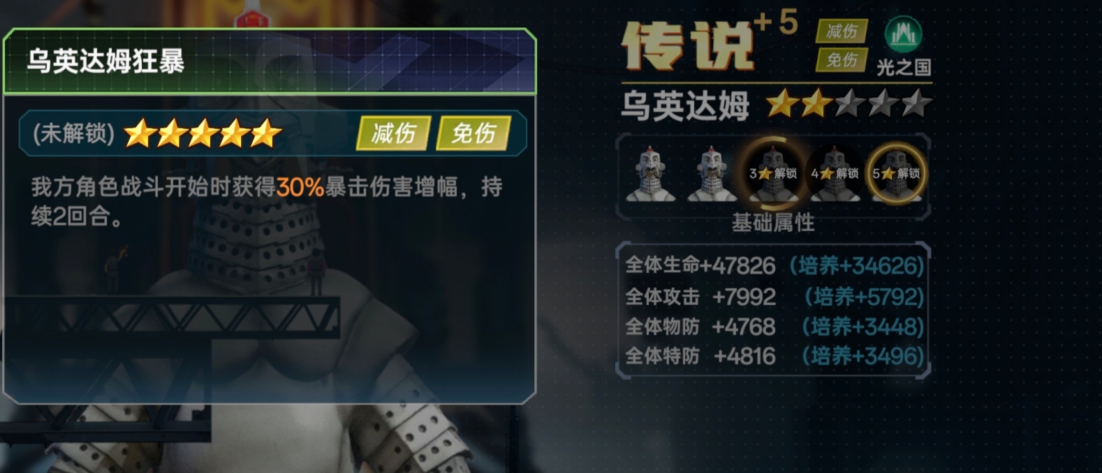 ④乌英达姆:升到5星以后第二个优先级是升星特拉菲扎因为加成的也是攻击和爆伤增幅。
