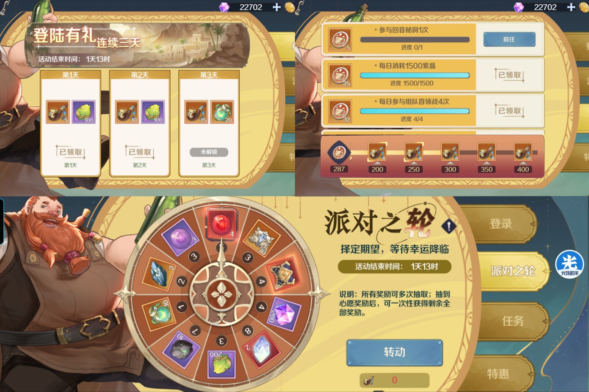 3:活动的玩法板块:主要分为四大板块:①登录奖励、②派对之轮、③任务奖励、④活动特惠礼包。