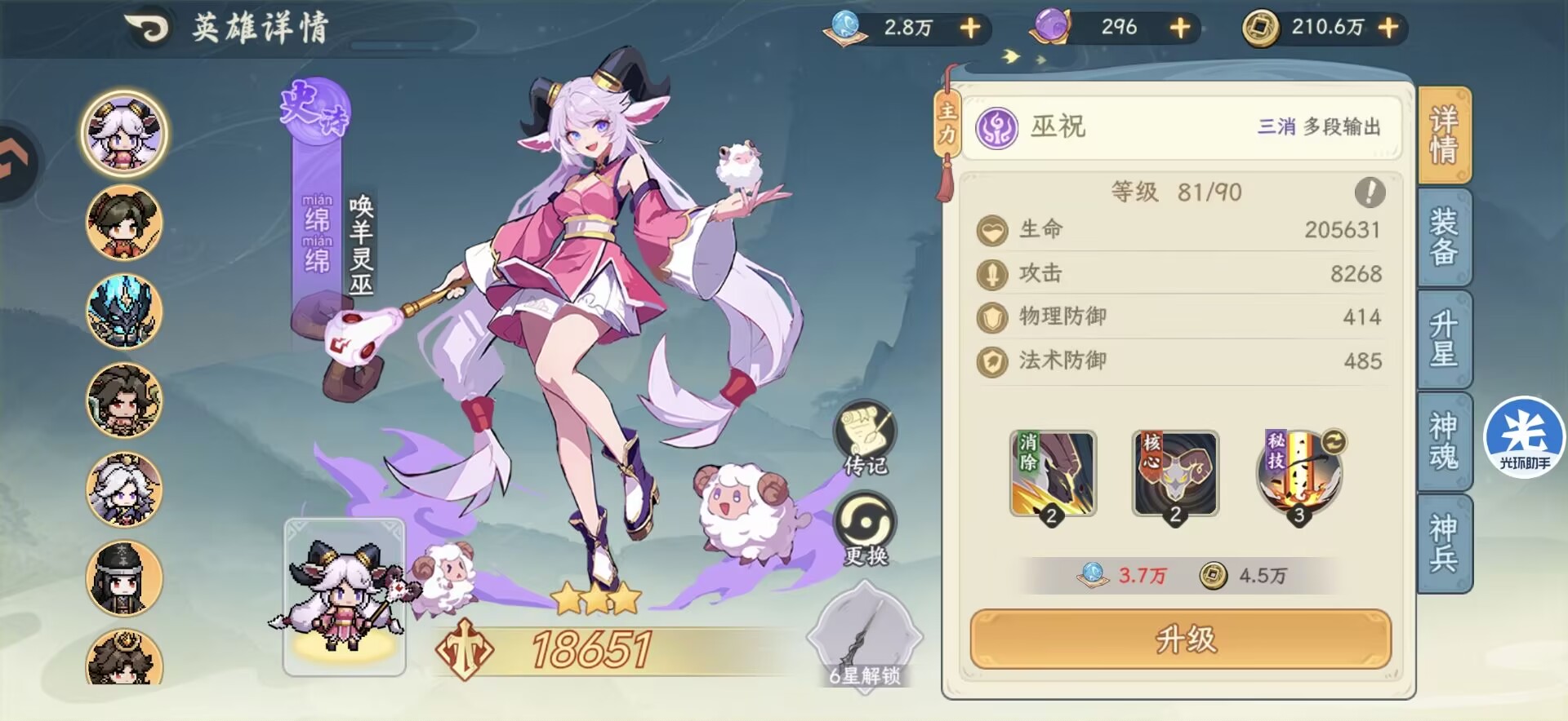 ③绵绵:开局就送的角色,前期很好用,可以召唤羊群对一列敌人进行冲撞,配合干戈造成的伤害不俗!