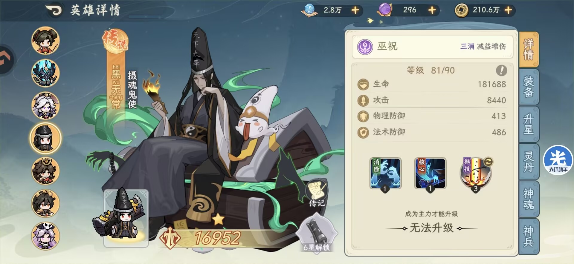 武罗:群体治疗+同时可以给黑无常提供暴击加成,进一步提升黑无常的输出能力。