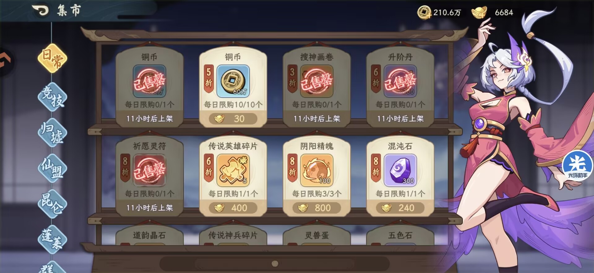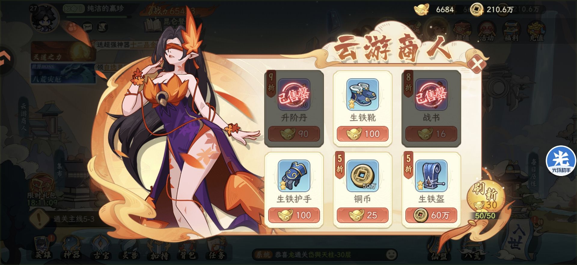 ①云游商人的:升阶丹和战书必买,升阶丹我们前期很缺,用来突破角色的等级。