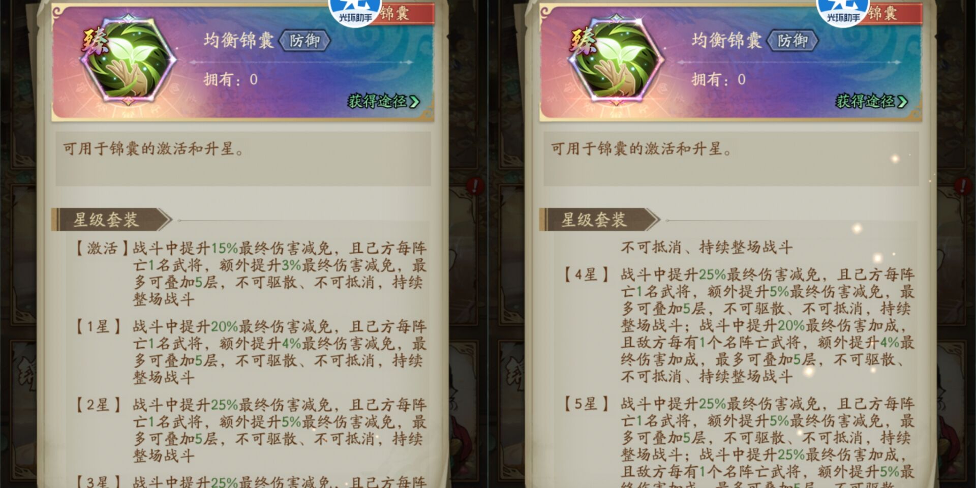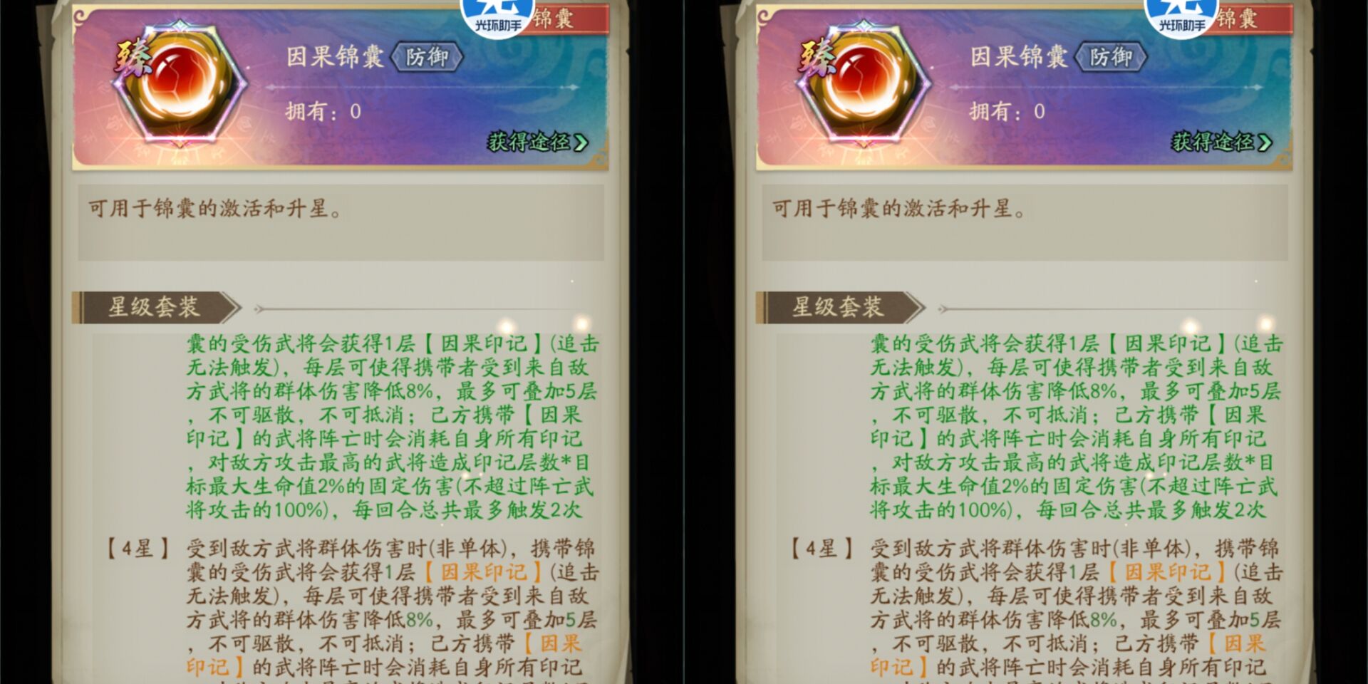 解析:因果锦囊作为老牌第一批锦囊,强度一直流不高。主要降低受到的群体伤害,理论最大可以降低40%的群体伤害,对法师有比较好的克制作用。比如:袁绍 蔡文姬 张角这类比较好用!