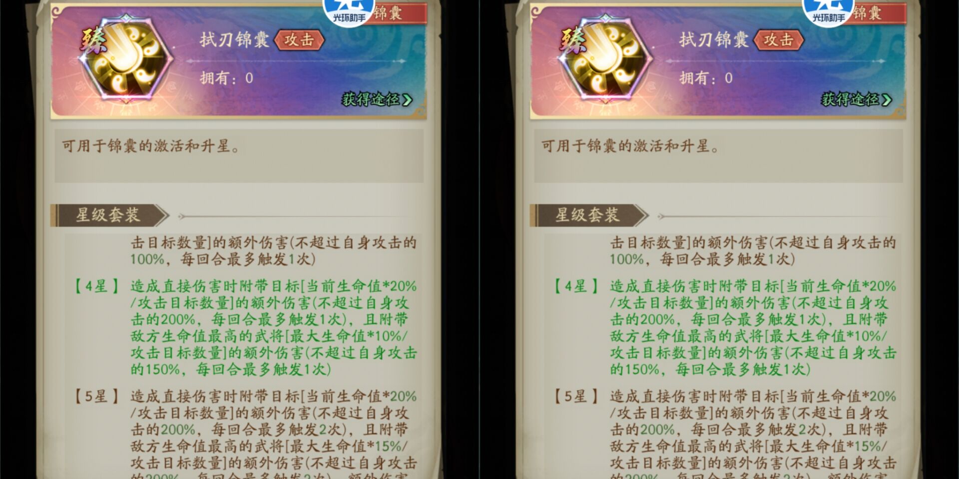 解析:提升15%直接伤害,本回合对同个目标造成的攻击次数越多,伤害就越高,最多可以提升35%的直接伤害,很适合像马超华雄这种追击多的武将。