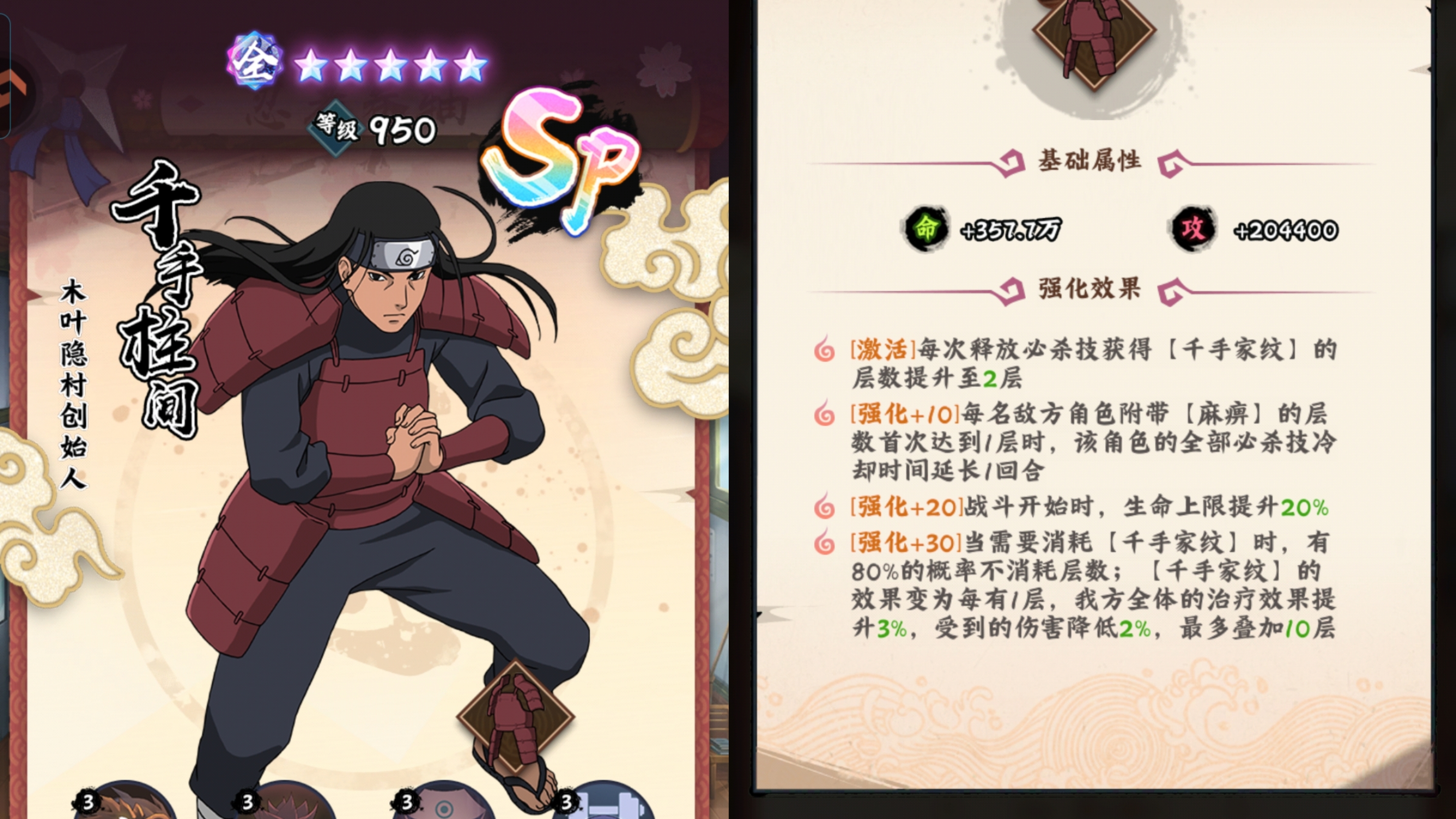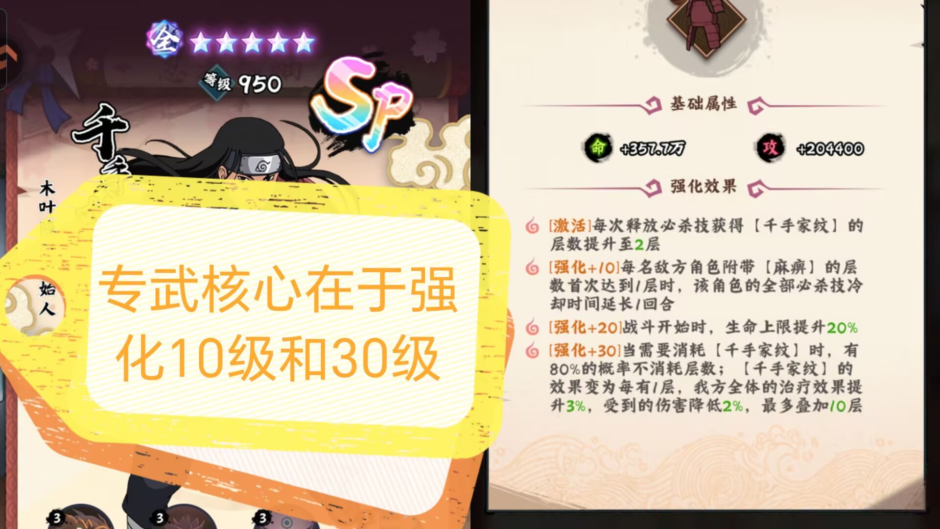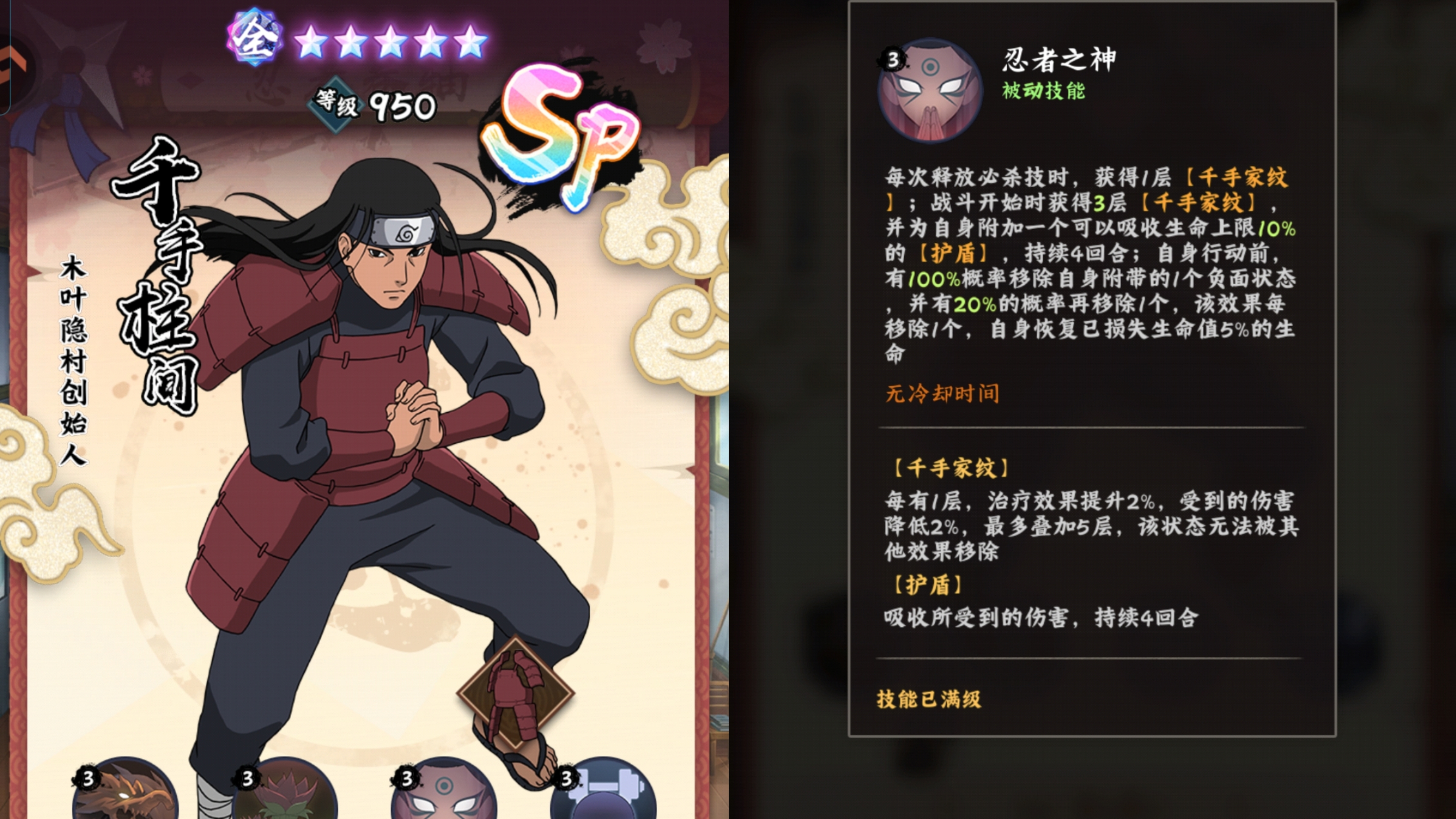 ⭐强化30级:是质变!因为在释放主动技能消耗千手家纹buff的时候,有80%概率不在消耗层数这就让buff可持续性大大增强!也保持了技能的最大的效率。