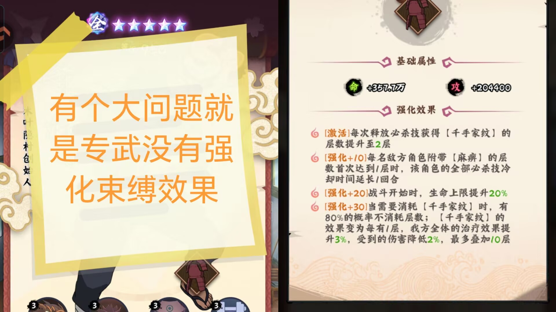 ②第二个缺点:需要高专武!专武太低也不好用特别是千手家纹buff完全跟不上技能消耗的速度。