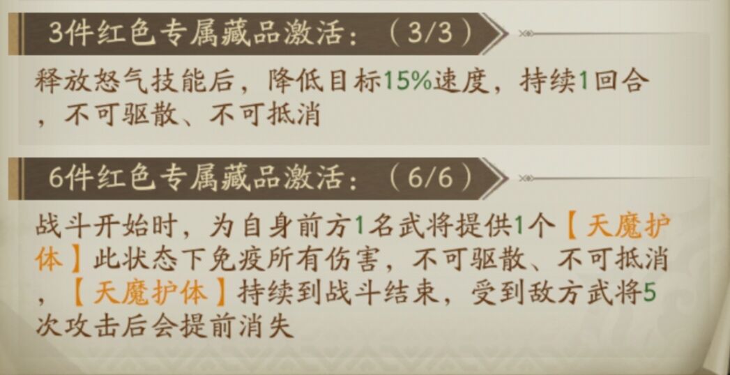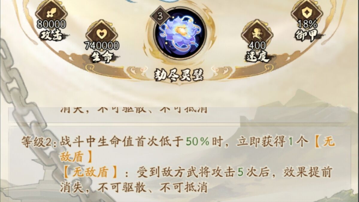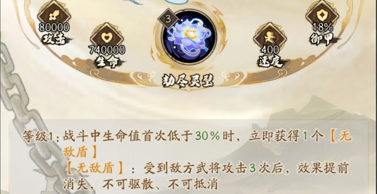 总结:佩戴后到武将在战斗中生命首次低于30%可以立刻获得1个无敌盾。