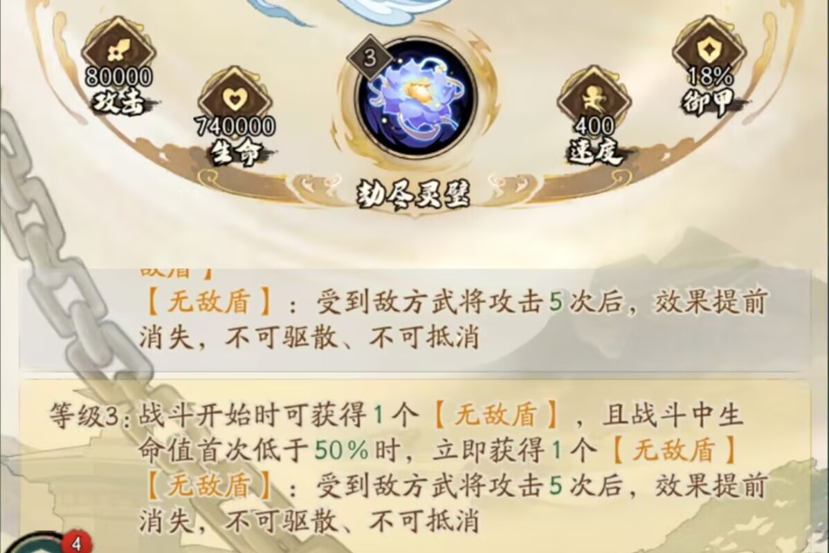 并且在生命低于50%的时候又可以获得1个无敌盾,相当于一场战斗中可以获得10次格挡攻击的无敌盾,能够极大提升武将的生存和容错率提升反打能力。
