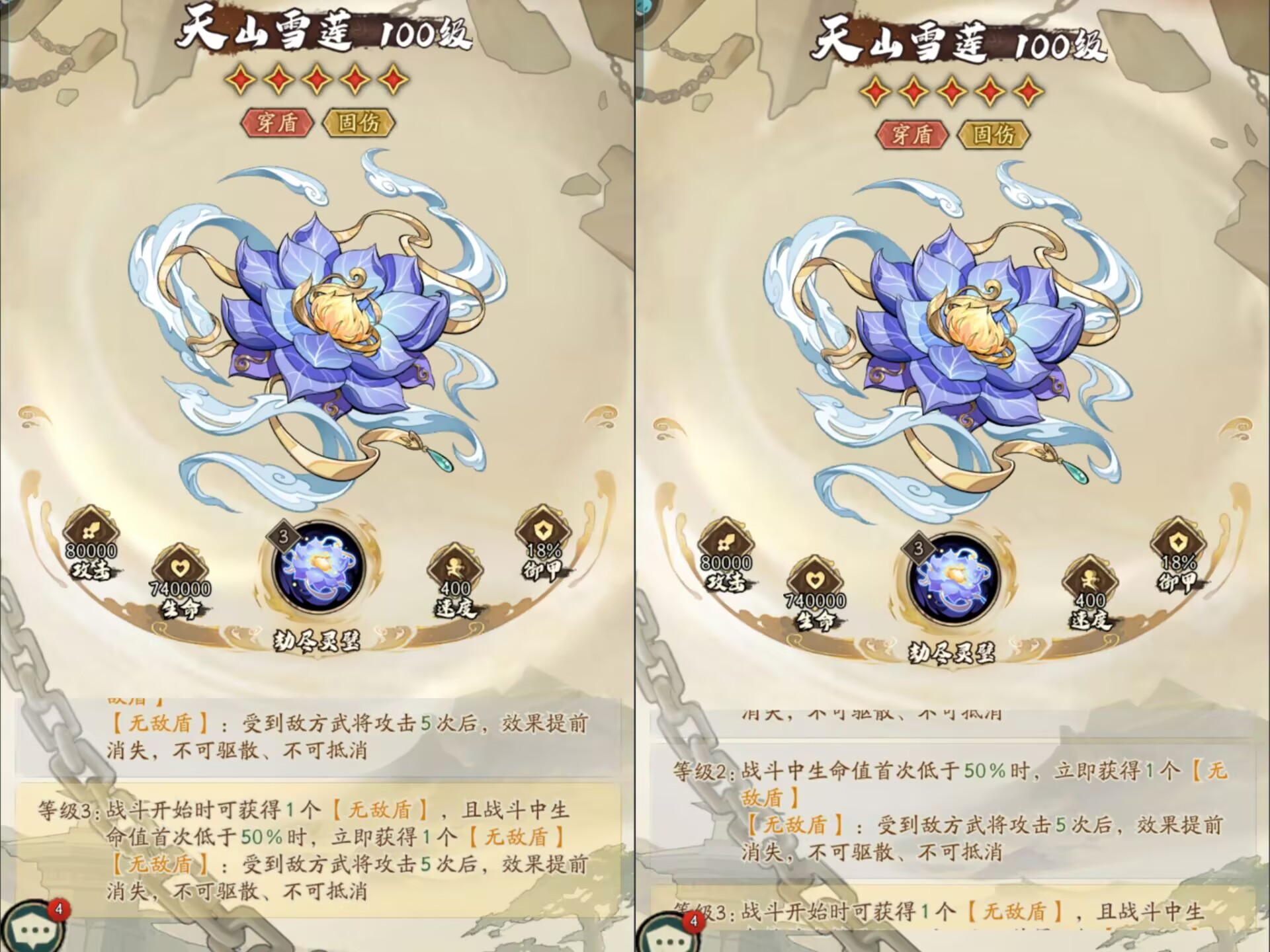 对比1级的无敌盾保护能力最强,抵挡攻击的次数更多,但此刻天山雪莲还不是质变。