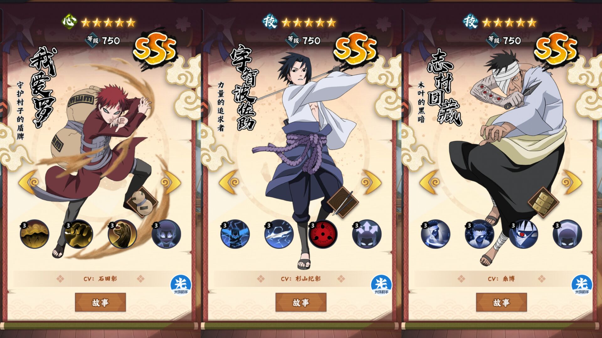 ③sss前期忍者能用有:佐助、团藏、我爱罗、照美冥(这些对平民玩家来说都能用一个月左右或者更短的时间)