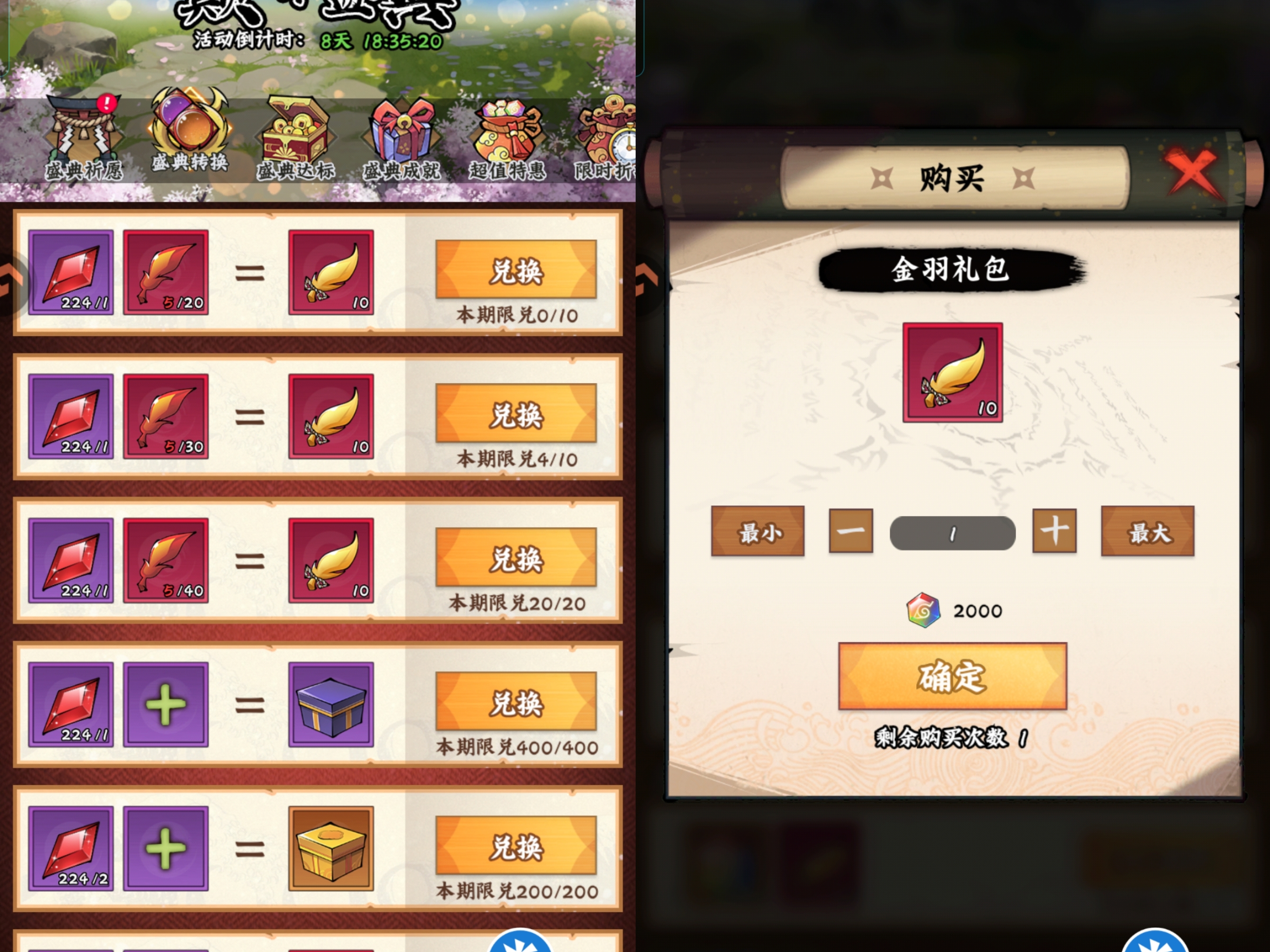 20赤羽=10金羽。30赤羽=10金羽的兑换礼包