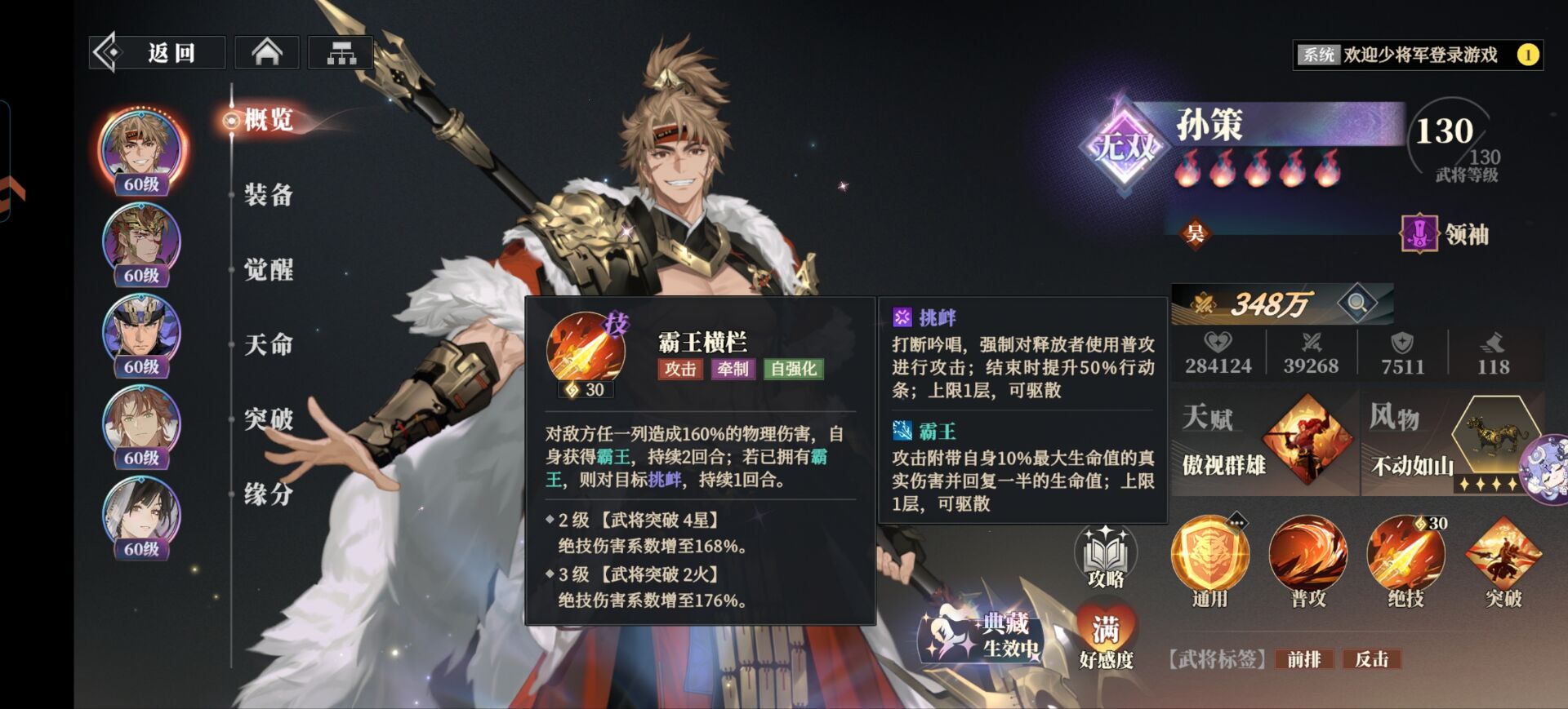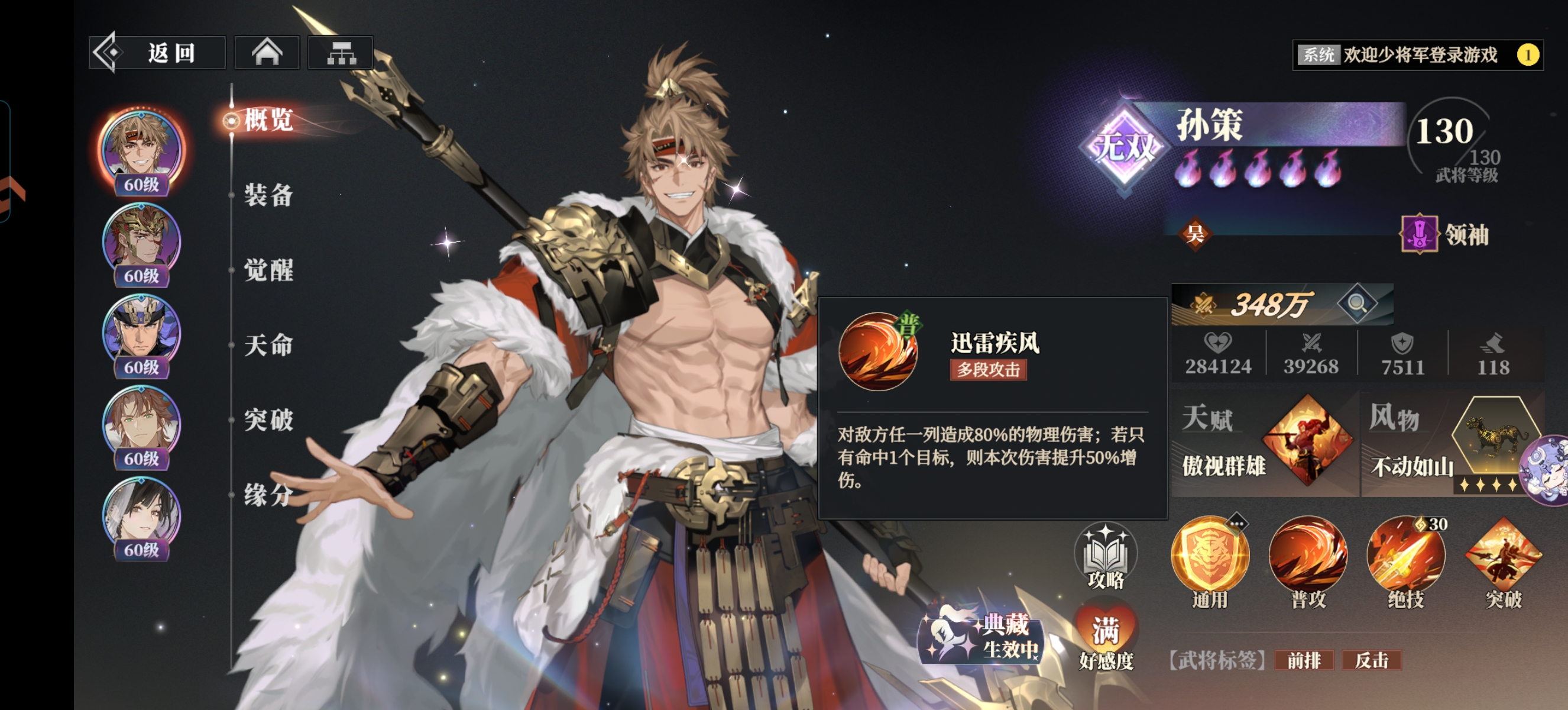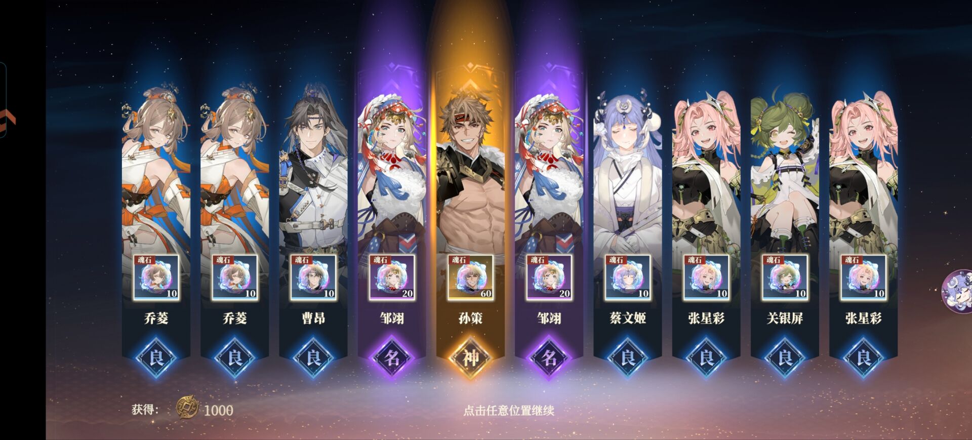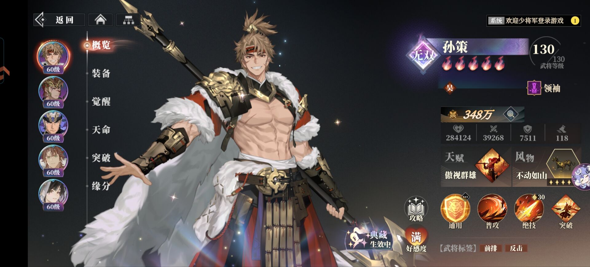 三:【孙策】抽取建议:无脑直接冲5火。综上所述!孙策是一个非常全面的T0能抗能打的攻击盾!也是目前pvpT0武将。