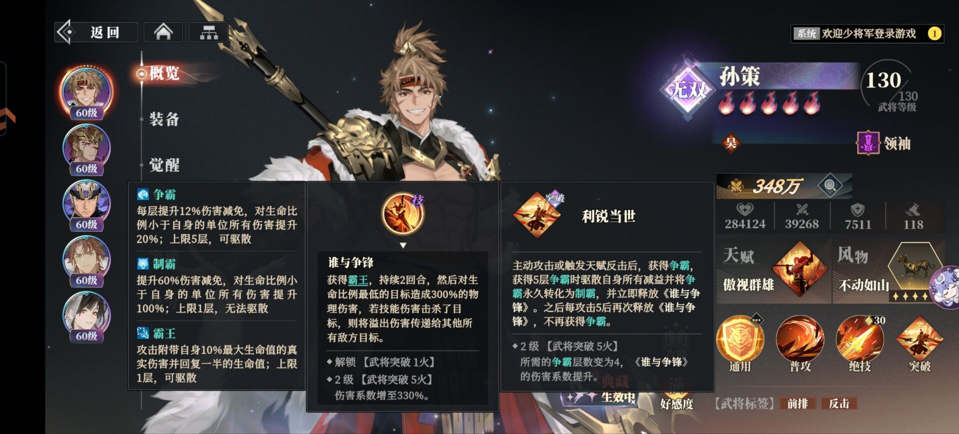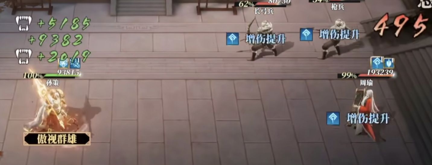 ②【争霸】和【制霸】这两个增益都是可以大幅度提升自身的抗压能力和输出的!并且成功激活制霸后还无法被驱散。5:其次孙策伤害非常恐怖!