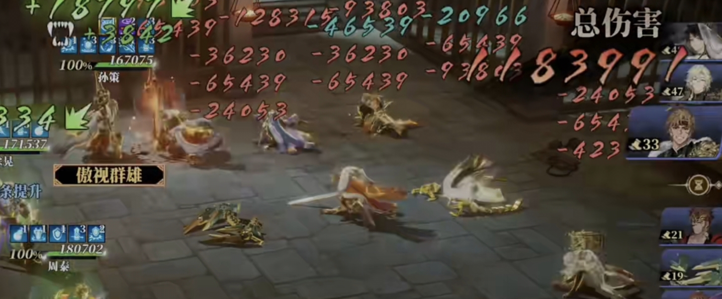 总结:在实战中争霸叠的速度还是很快的,所以孙策一定要放前排这样可以更多触发反击进行叠争霸,快速叠满5层争霸以后触发【谁与争锋】收割残血敌人,同时溢出伤害收割全场!