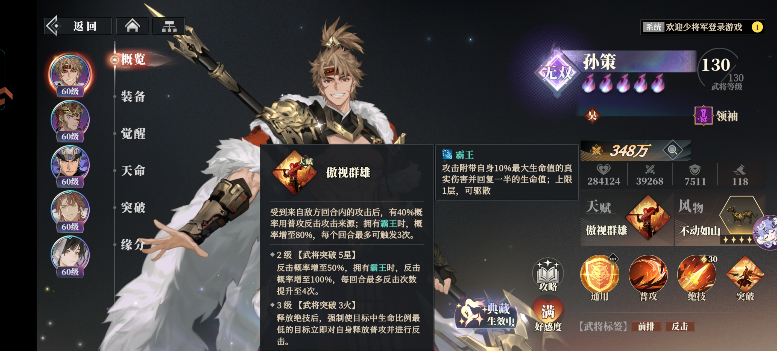 2:pve表现能力:4星⭐⭐⭐⭐(具体表现在烽火台、历战等玩法,孙策可以利用自身天赋反击配合霸王增益打出真伤并且进行回血续航,形成打不死的小强永动机!在pve中配合多动反击高效回血续航非常夸张)